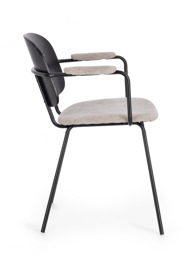 La struttura di questa sedia è realizzata in acciaio verniciato a polvere epossidica, garantendo resistenza e durabilità nel tempo. Il suo schienale è realizzato in compensato rivestito in legno di pioppo, donando un tocco naturale e caldo alla sedia. La seduta e i braccioli sono realizzati in compensato e rivestiti al 100% in poliestere, offrendo comfort e morbidezza al contatto. La sedia viene fornita da assemblare, permettendo di personalizzare il tessuto secondo le proprie preferenze.