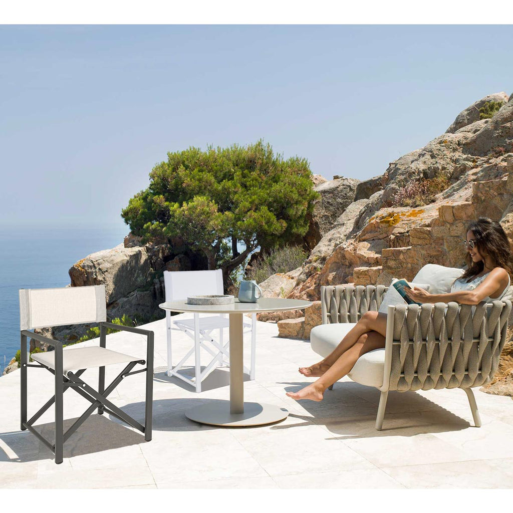 La sedia da giardino tipo regista Gilda è un prodotto con una struttura 100% alluminio, che conferisce solidità all'intero prodotto. Tutte le sedie da giardino tipo regista e tutti i prodotti della nostra linea sono trattati con vernici specifiche per l'utilizzo del prodotto in spazi all'aperto. Questa lavorazione è utile per tutti i prodotti che saranno utilizzati all'esterno, poiché consente di prevenire l'erosione dei componenti del prodotto.Ideale per utilizzo in giardino o in veranda, la sedia da regista Gilda si ispira al design delle intramontabili sedie regista cinematografiche. L’utilizzo di materiali resistenti ed innovativi la rende un complemento d’arredo outdoor immancabile. La sua qualità e ricercatezza creano un'armoniosa unione che consente il rimando mnemonico a tempi