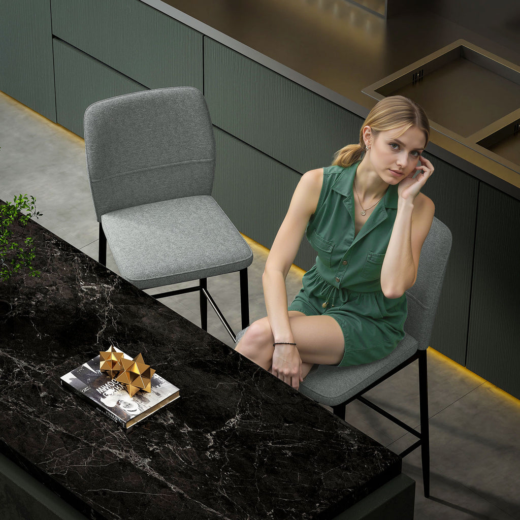 - DESIGN ELEGANTE: Questo set di sgabelli da bar fonde il calore del tessuto vellutato con un elegante telaio in acciaio nero minimalista, creando un incantevole contrasto di stili