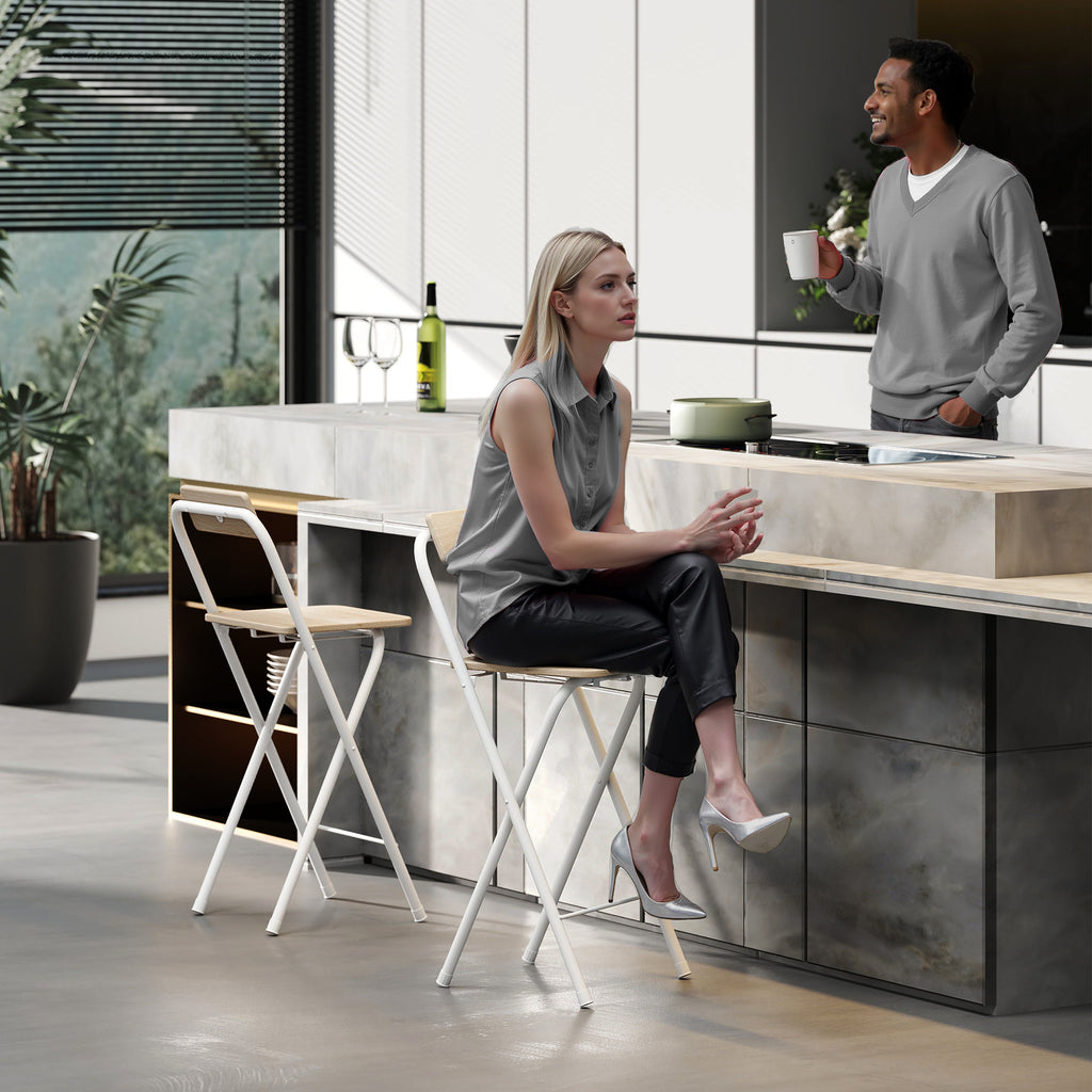 - PIEGHEVOLI E SALVASPAZIO: Il nostro set di 2 sgabelli da bar può piegarsi completamente per essere riposto con facilità sotto i banconi da cucina o da bar, consentendoti di risparmiare spazio a sufficienza