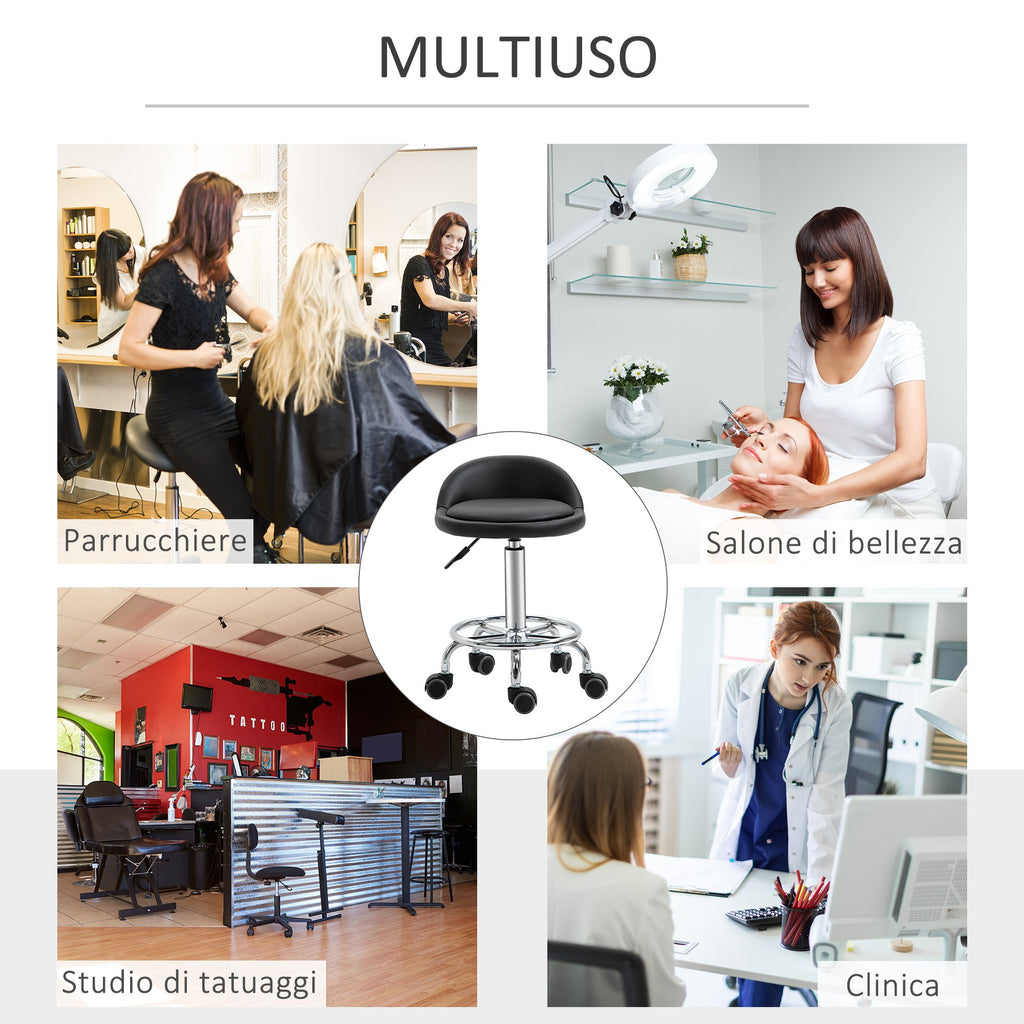 Questi sgabelli girevoli sono gli assistenti perfetti per molti professionisti. Con la loro altezza regolabile permettono di trovare l'assetto giusto per ogni lavoro, ideale per parrucchieri, estetisti, tatuatori, ecc. Le 5 ruote e la seduta girevole offrono massima praticità per spostarsi in ogni direzione e con la seduta imbottita assicurano un comfort ottimale. L'unione della struttura metallica alla seduta in similpelle PU dona inoltre un tocco elegante, perfetto per ogni ambiente.