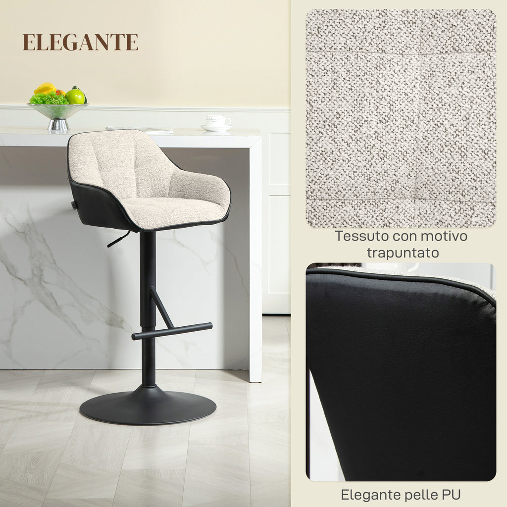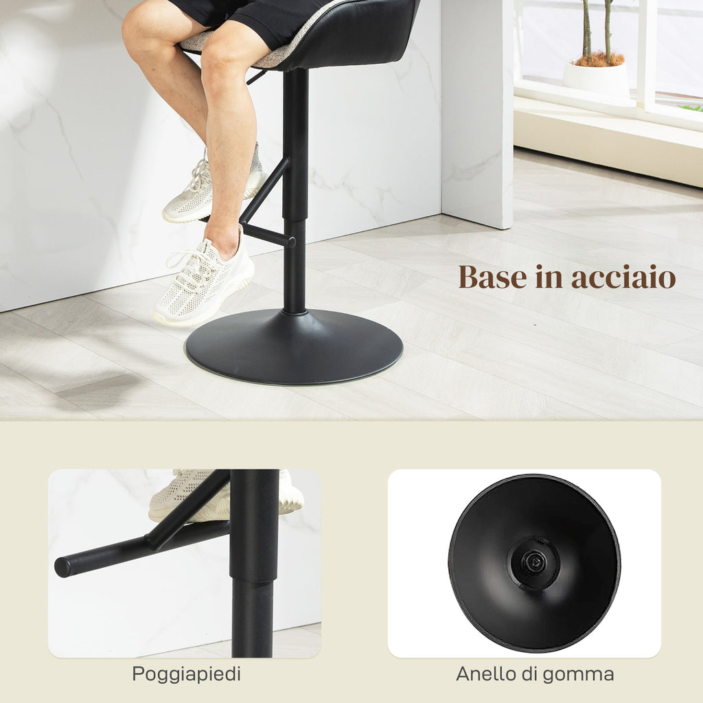 Rendi più accogliente e raffinato il tuo spazio interno con questo set di 2 sgabelli alti. Il set combina un rivestimento in tessuto effetto lino trapuntato con la raffinata pelle PU, garantendo eleganza e comodità per ogni seduta. Sfrutta la praticità dell'altezza regolabile e della seduta girevole a 360°, perfetti per ogni bancone da bar o da cucina. Goditi tanti momenti di relax e conversazioni in compagnia.