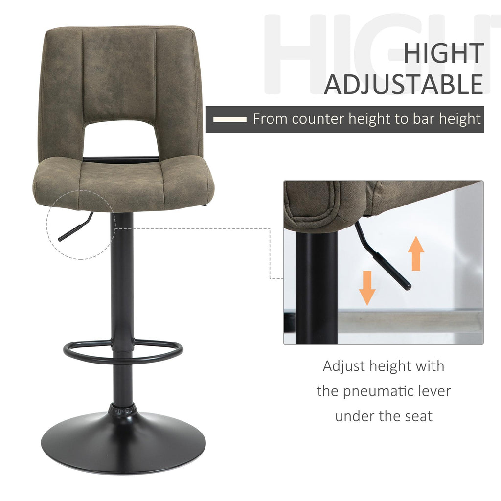 Bevi il tuo aperitivo in compagnia, senza rinunciare al comfort! Il tuo nuovo set con 2 sgabelli alti da bar è progettato per offrirti la massima comodità: la seduta è imbottita e girevole, ha un poggiapiedi e uno schienale per aiutarti a mantenere la giusta postura anche nei momenti di relax. La struttura ha un'ampia base rotonda in metallo con tappetino antigraffio e antiscivolo.