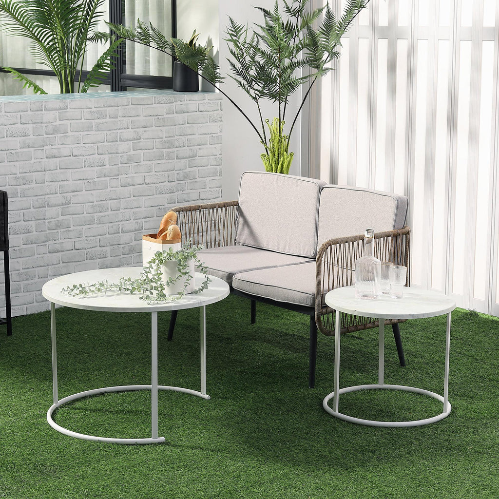Set 2 Tavolini da Giardino in Metallo Piano Effetto Marmo Bianco