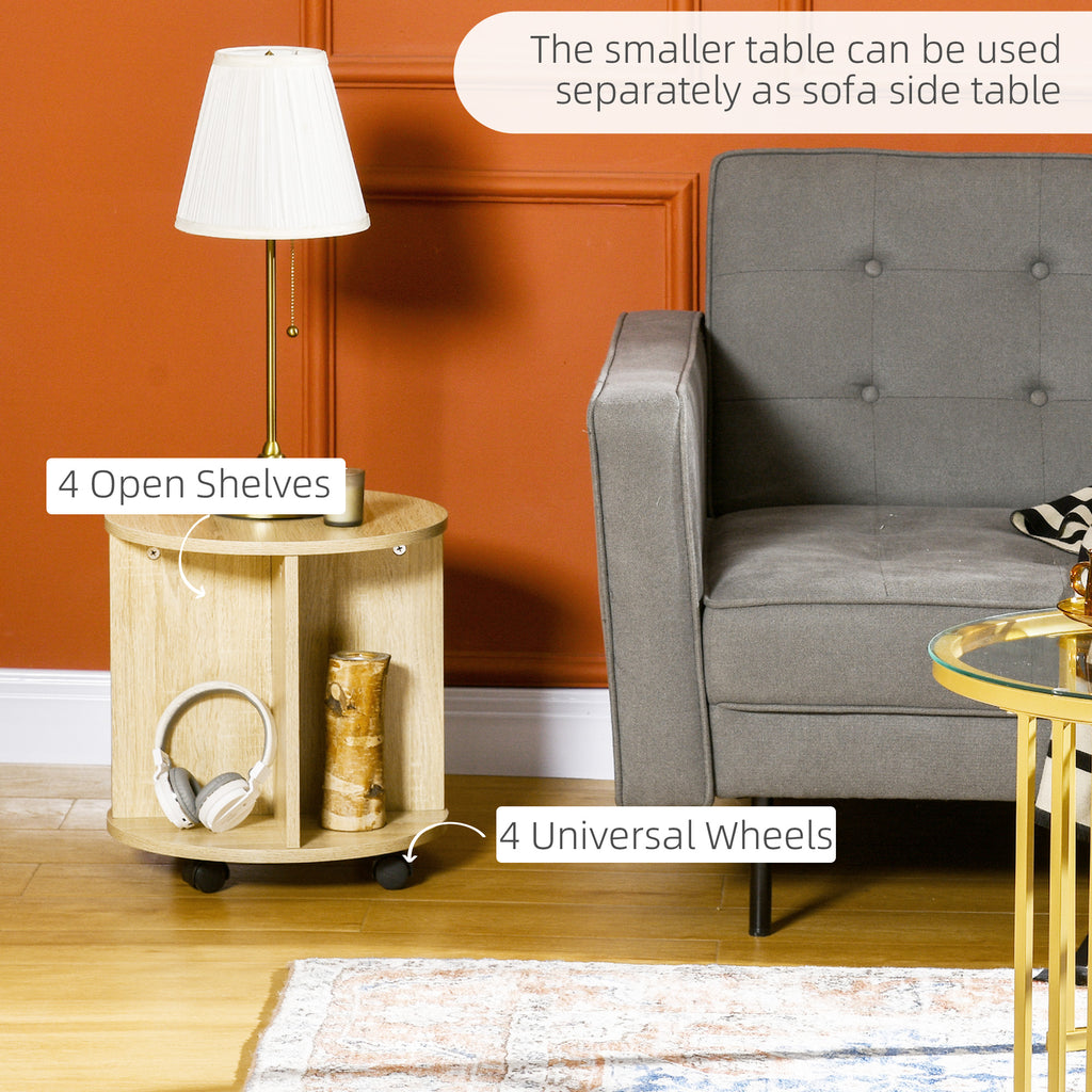 - DESIGN SEPARABILE O ANNIDATO: Questo set di tavolini da caffè è composto da un tavolino rotondo piccolo e uno grande da utilizzare in maniera indipendente o annidata insieme, posizionando quindi il tavolino piccolo sotto il tavolino grande e risparmiando così un po' di spazioAMPIO SPAZIO A DISPOSIZIONE: I 4 ripiani aperti del tavolino da salotto offrono un ottimo spazio per inserire gli oggetti che preferisci ed eliminare il disordine in giroFACILE DA SPOSTARE: Il tavolino da divano è costruito su quattro ruote girevoli per consentire una facile mobilità. In qualsiasi punto del soggiorno, della camera da letto o dello studio, questo tavolino sarà sempre al tuo fiancoSTRUTTURA SOLIDA: Il tavolino più grande possiede un piano in vetro temperato e una struttura in acciaio dorato, mentre quello piccolo è realizzato in truciolato con impiallacciatura in legno di quercia, per donare uno stile moderno e variegato ai tuoi spazi. Entrambi i tavolini da caffè sono adeguatamente robusti e resistenti per reggere cibo e bevandeDIMENSIONI: Dimensioni complessive: Ø60 x 47A cm (tavolo grande), Ø40 x 42A cm (tavolo piccolo). Capacità di peso: 25kg (tavolo grande), 17kg (tavolo piccolo). Montaggio richiesto