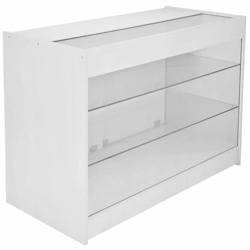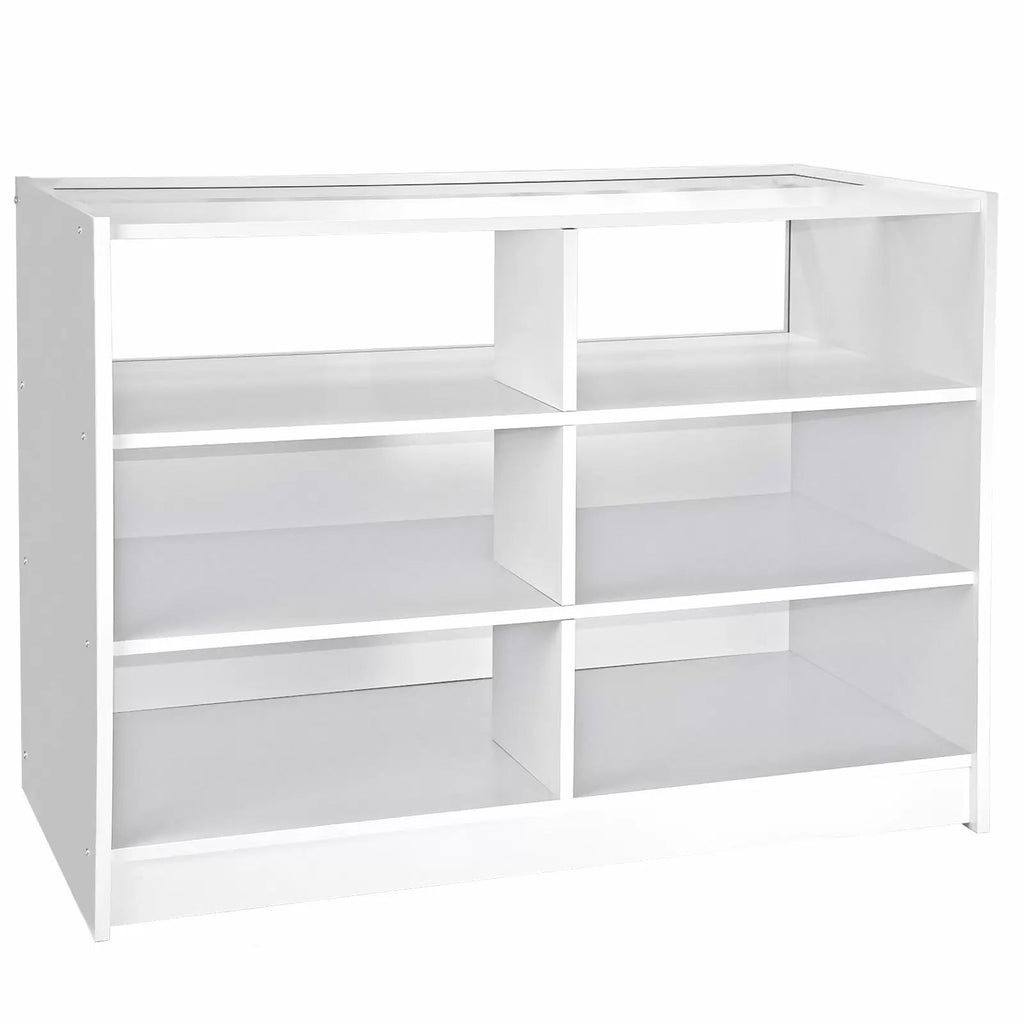 Un bancone chiuso con pannelli in vetro nella parte superiore e nella parte alta della parte frontale per mostrare e proteggere allo stesso tempo i tuoi articoli. Facile accesso attraverso l’apertura posteriore. Ci sono anche due ripiani così puoi immagazzinare oggetti sotto il bancone. Dimensioni: 90cm (altezza) x 120cm (larghezza) x 60cm (profondità).