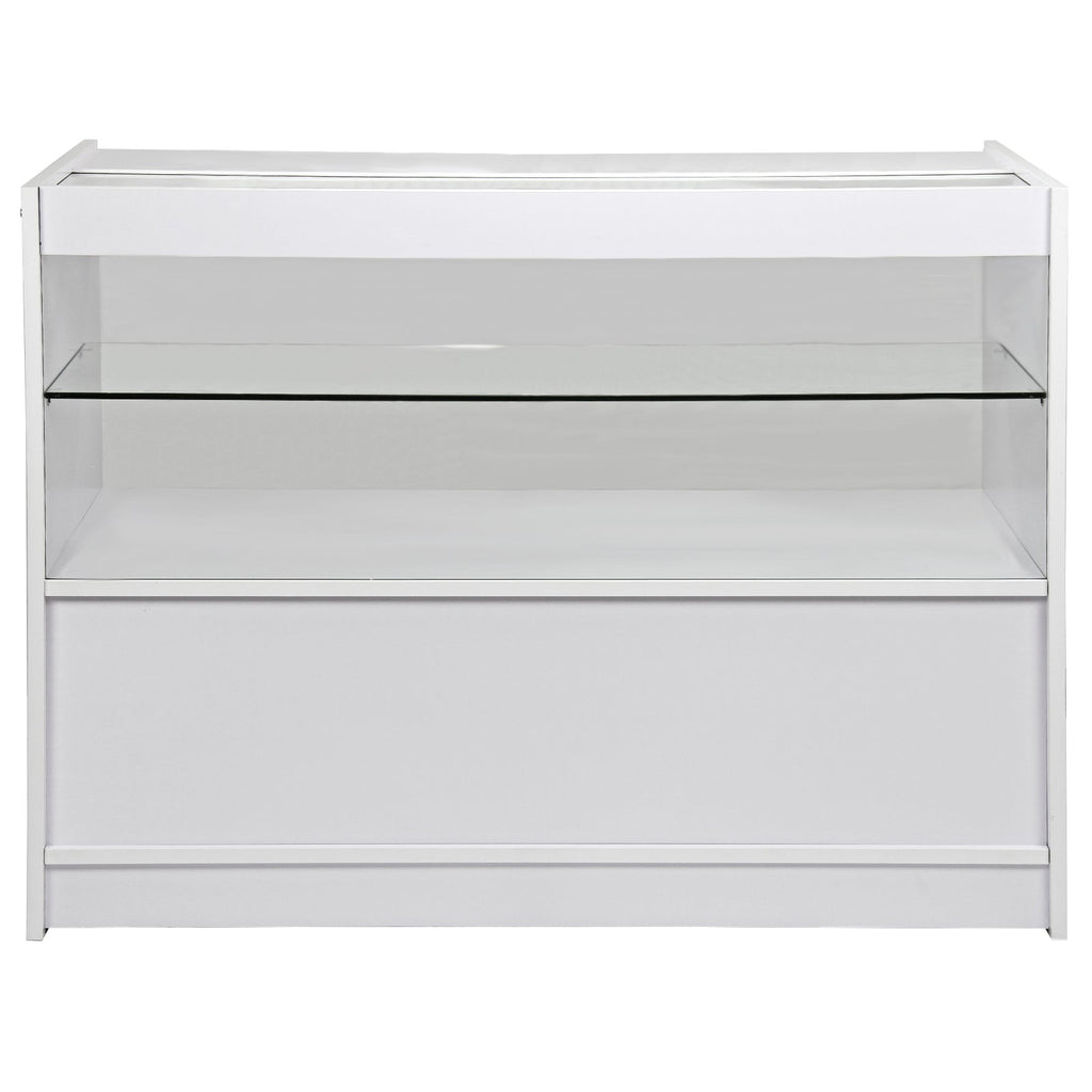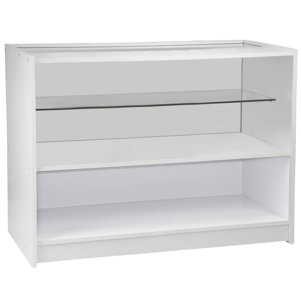 Questo banco è ideale per esporre i prodotti grazie alla sua grande area espositiva con pannelli in vetro sulla metà alta della parte frontale e sulla parte superiore. Ha una rimuovibile mensola in vetro che permette di mettere in mostra ancora più prodotti, mentre la metà bassa della parte posteriore è aperta per permetterti di immagazzinare vari oggetti. Dimensioni: 90cm (altezza) x 120cm (larghezza) x 60cm (profondità). Colore: bianco brillante.