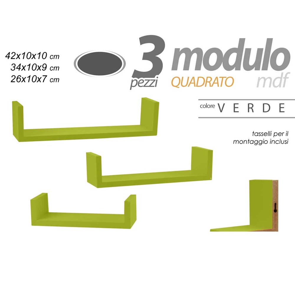 Ogni mensola è realizzata interamente in legno mdf in un bellissimo colore verde ed ognunaè fornita di 1 ripiano d'appoggio con bordo che impedisce la caduta degli oggetti su entrambi i lati.