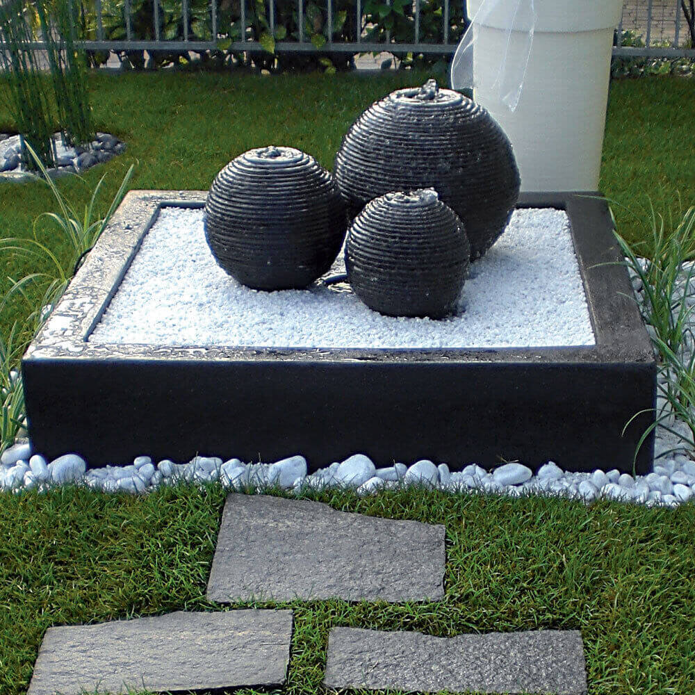 Fontana con 3 sfere color nero con illuminazione a led, realizzata in vetroresina e rifinita con polveri di marmo e quarzo.