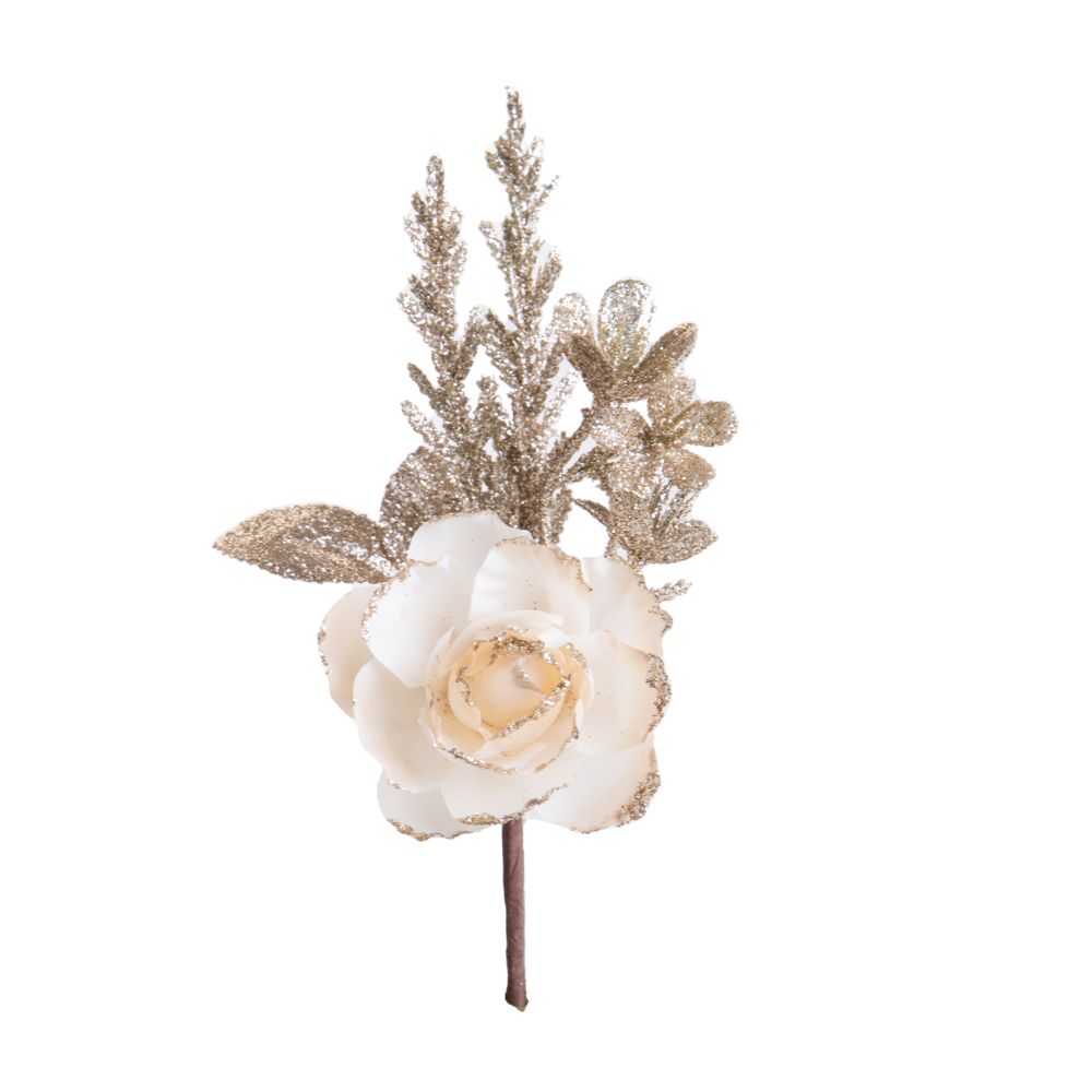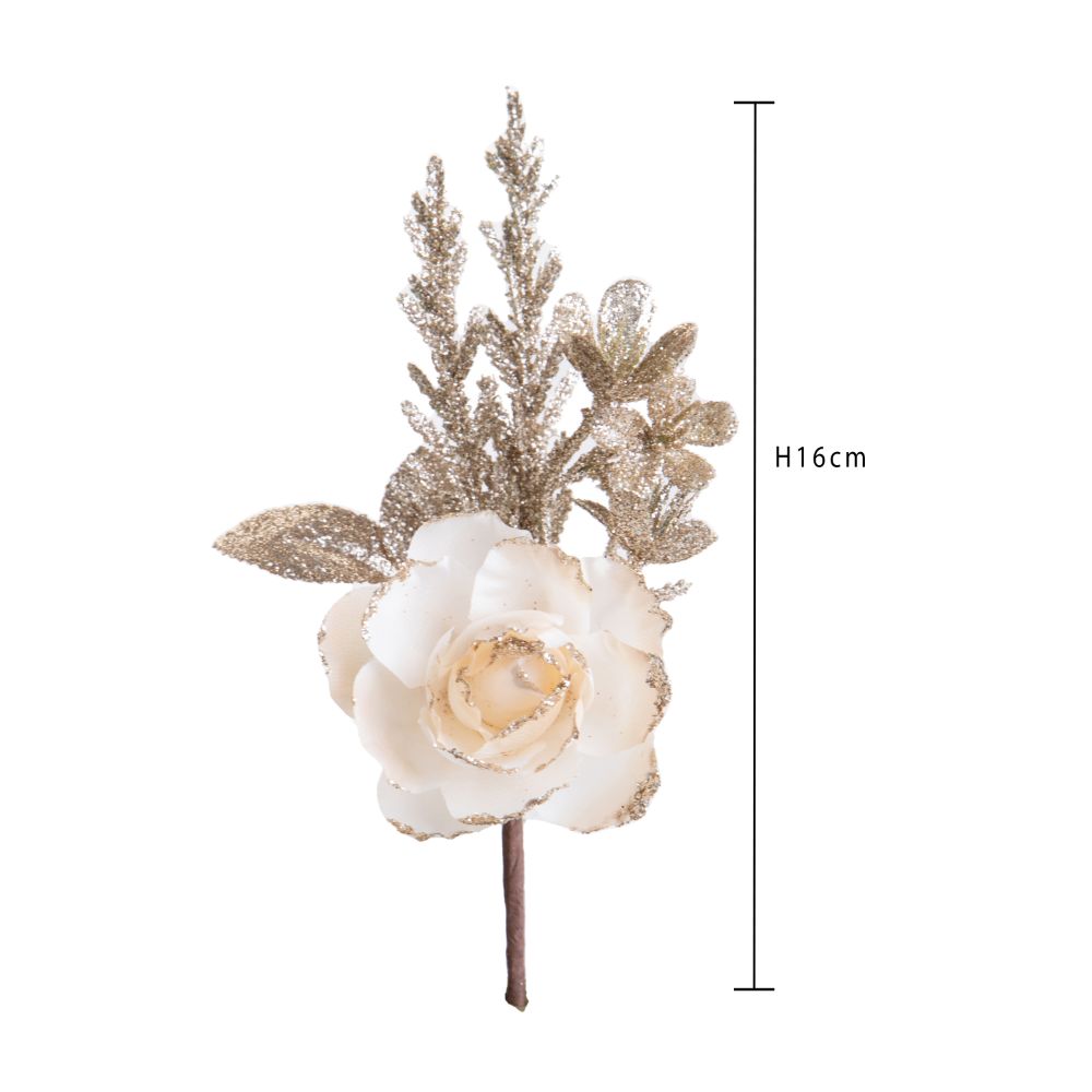 - Decorazione unica con una rosa bianca rifinita con glitter dorati.