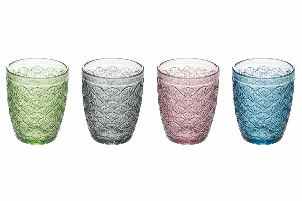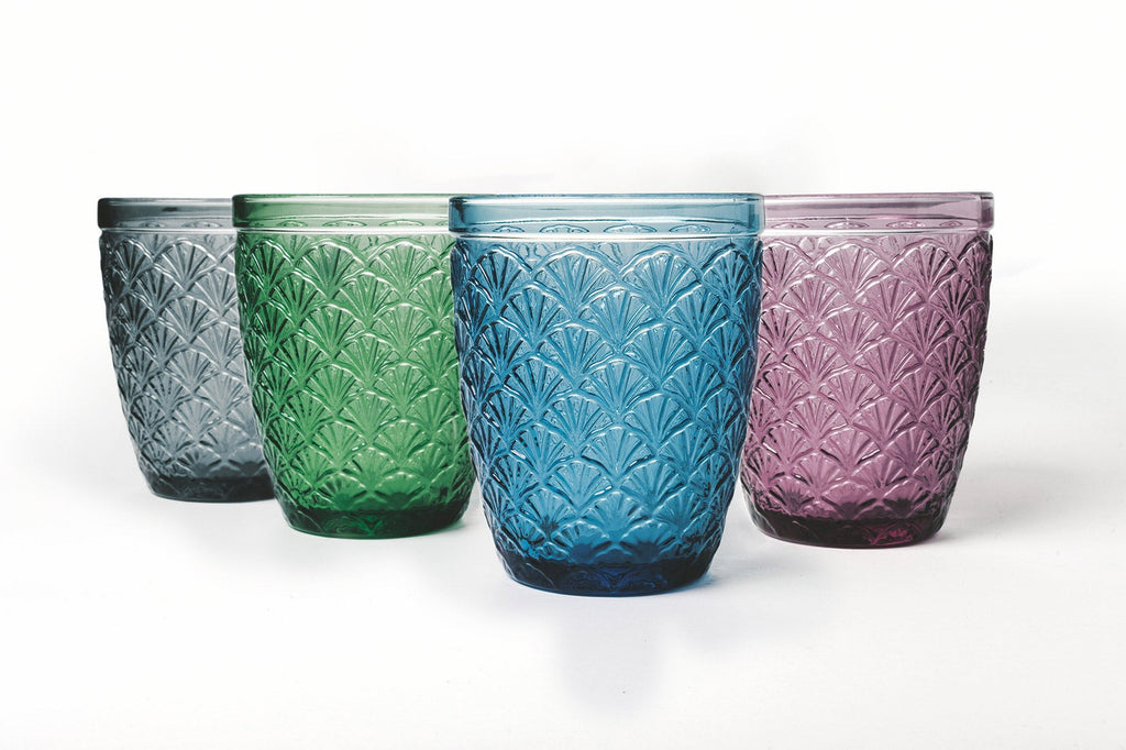 Deco: arte e convivialità Con i bicchieri Deco la convivialità incontra l'arte. La superficie intagliata si ispira all'Art Déco, riproponendone i motivi geometrici che hanno caratterizzato l'intera produzione del periodo. La composizione diventa attuale grazie ai quattro colori diversi per ogni posto tavola.