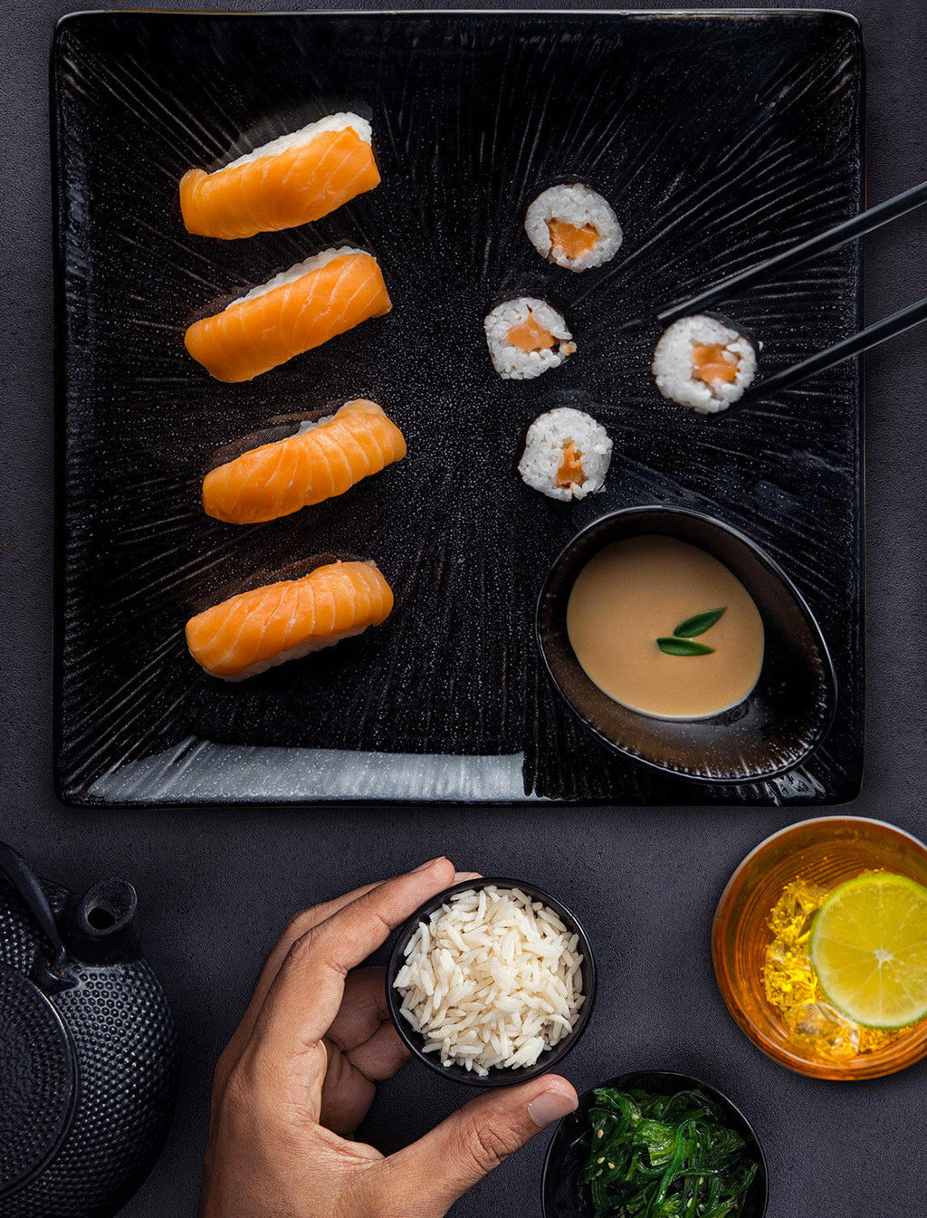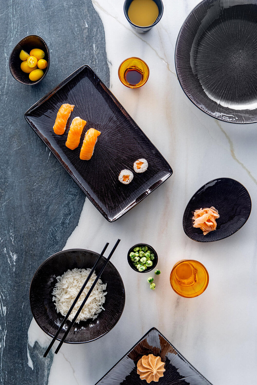 - Forme: piatto quadrato ampio e dal bordo leggermente rialzato che lo rendono pratico e adatto a contenere le più diverse pietanze. Innegabile l'ispirazione orientale della forma che si adatta perfettamente al sushi. Il colore nero tuttavia lo rende particolarmente interessante per chiunque ami creare contrasti di colore con le pietanze e pertanto il prodotto è utile ad impiattare numerosissimi cibi.