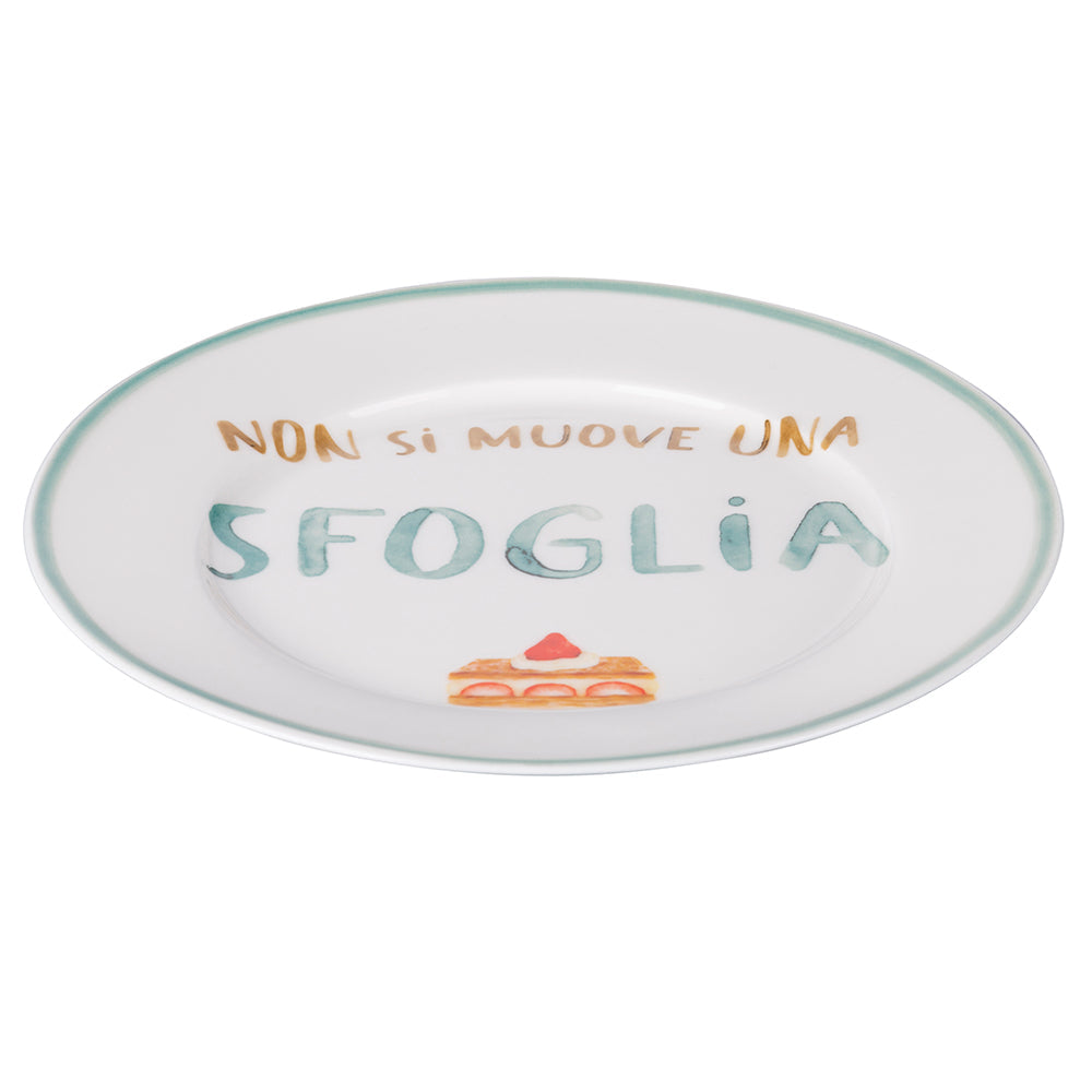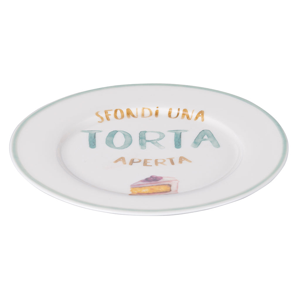 - Colore: fondo bianco, bordo acquamarina, scritte e disegni dessert