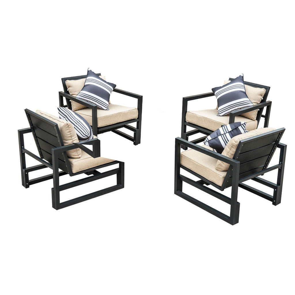 Le 4 poltrone sono realizzate in struttura di alluminio rivestita di legno composito WPC e sono di facile manutenzione e resistenti alle intemperie.