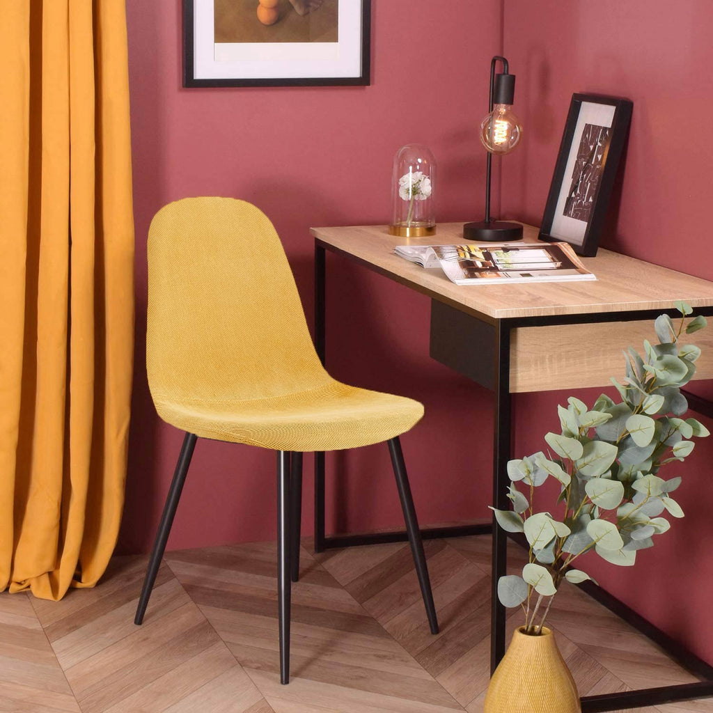 Perfette come sedie da salotto e come sedie sala da pranzo. Le sedie per soggiorno modello Bella condividono un design di gusto nordico, caratterizzato da uno stile minimal e da un'eleganza innata che mette insieme il freddo dei piedi in metallo dipinti di nero con il calore della seduta imbottita rivestita da morbido tessuto dal caldo color giallo paglierino.