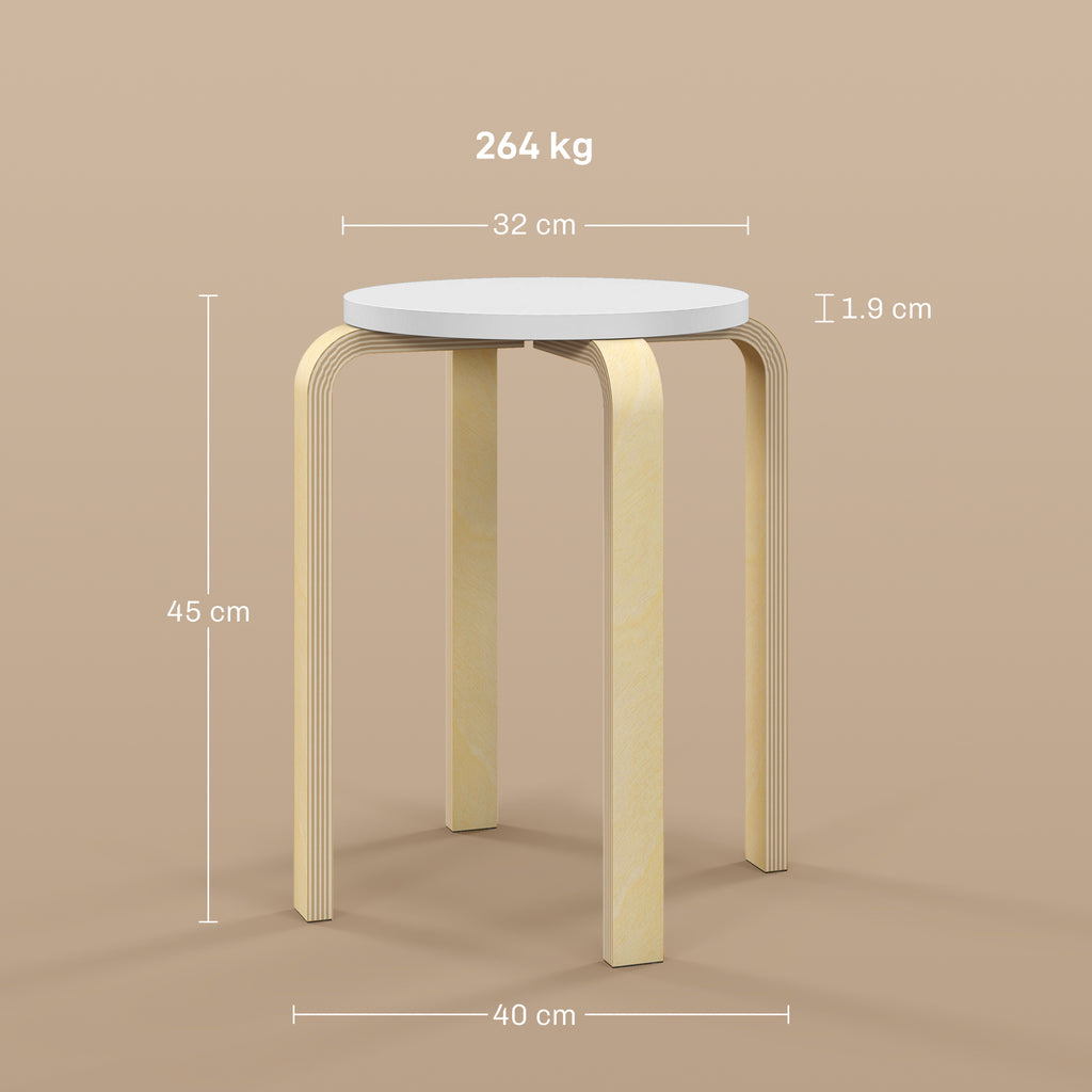 Lasciati conquistare dal fascino della semplicità moderna con questo set di 4 sgabelli impilabili. Questi sgabelli in legno sono dotati di una forma rotonda elegante e compatta, ma risultano anche pratici, grazie ai piedini antiscivolo inclusi. Perfetti per un uso versatile, i nostri sgabelli aggiungono un tocco di eleganza a qualsiasi ambiente e potranno essere messi uno sopra l'altro non appena non serviranno più.