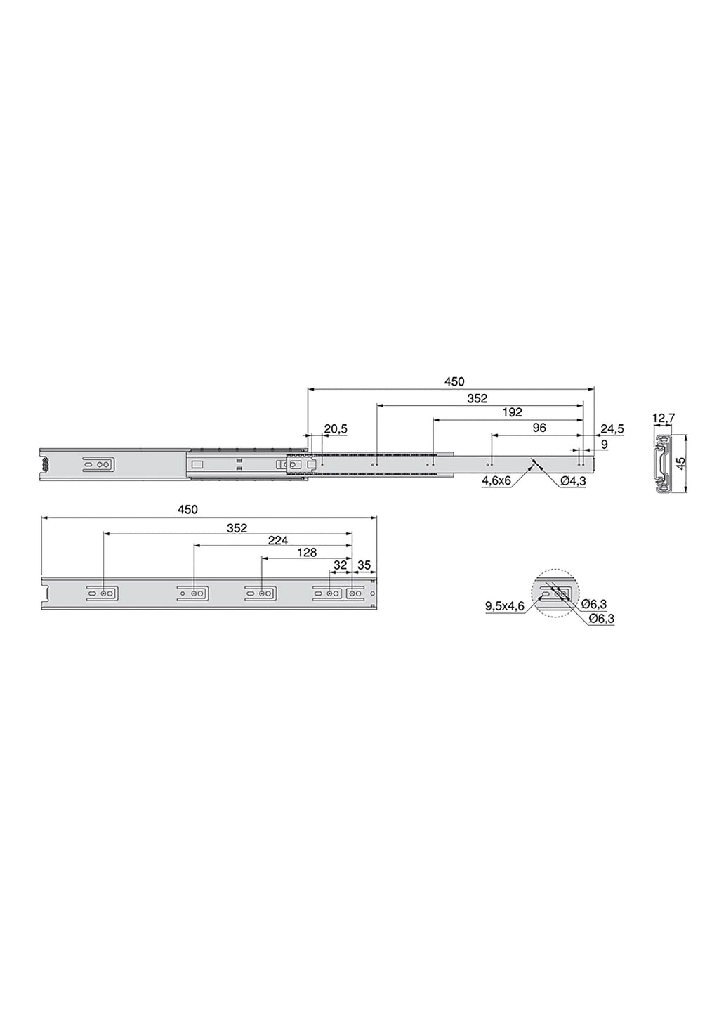 Guide con sfere con estrazione totale in acciaio zincato. Questo tipo di guida si adatta ad una fessura larga 45 mm al lato del cassetto. Si fissa al lato del mobile mediante viti (non incluse) e dispongono di un grilletto per lo smontaggio. Carico massimo fino a 30 kg.