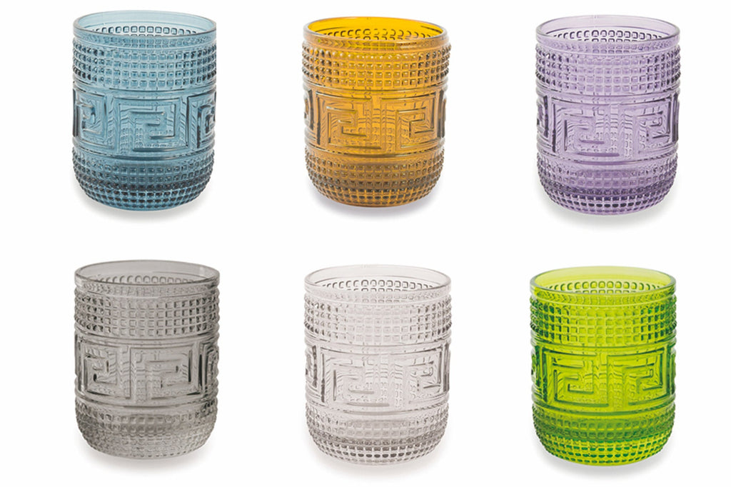 I bicchieri della linea Mykonos portano a tavola tutte le ispirazioni cromatiche dell'isola completandosi con un delicato motivo ellenico. Sono leggeri e connotati da un'irresistibile anima estiva che cede alla ricercatezza dei dettagli dati dalla lavorazione.