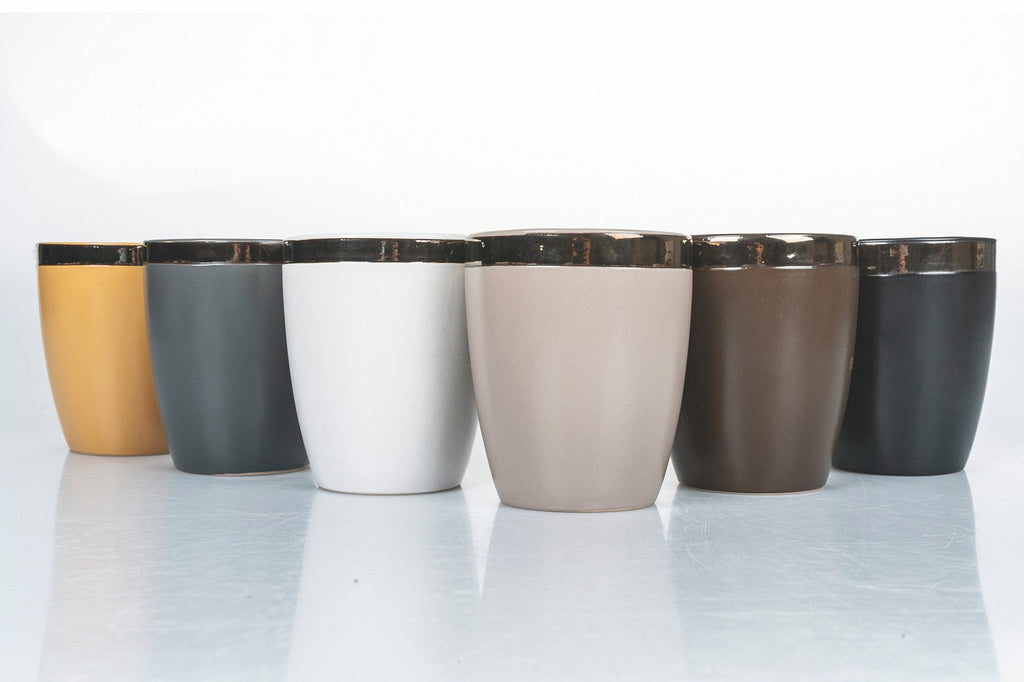 Bicchieri Naima: incontro materico I bicchieri Naima realizzano la perfetta combinazione materica tra due differenti finiture del gres. Un effetto pieno e opaco, che evoca le consistenze dell'argilla cruda, si chiude in un bordo Rame, creando un accostamento elegante e suggestivo.