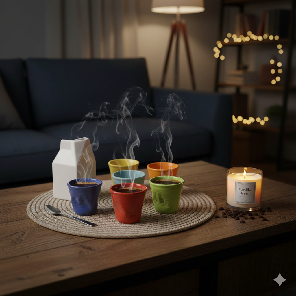 Set 6 Tazzine da caffè Accartocciati Multicolor con Lattiera Bianca in Gres Kaleidos