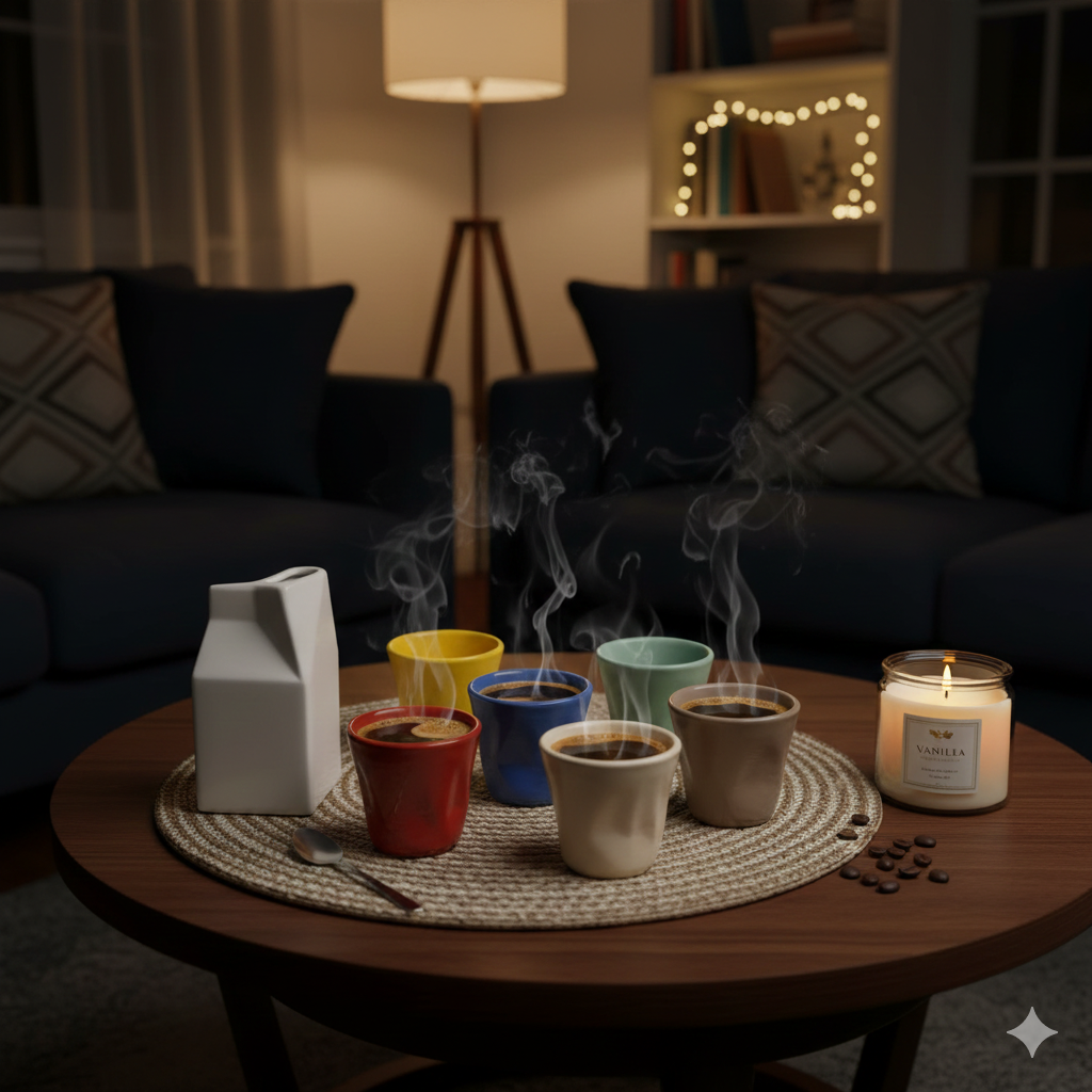 Set 6 Tazzine da caffè Accartocciati Multicolor con Lattiera Bianca in Gres Kaleidos