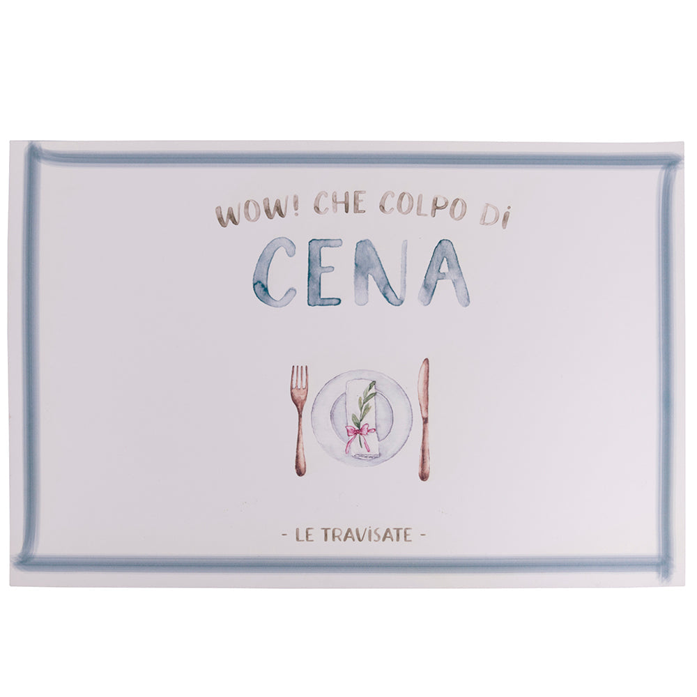 - Disponibile in 6 assortimenti: "Non tocchiamo questo PASTO"; "Stai una TAVOLA"; "Abbiamo stretto un PIATTO"; "Ho PRANZO lacrime di gioia"; "Wow! Che colpo di CENE"; "Per me va bene ma FAME voi".