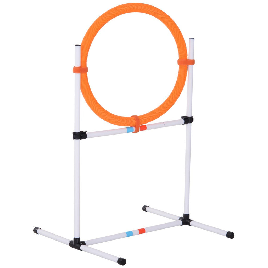 Tieni in esercizio i tuoi animali domestici con questa varietà di attrezzi, tra cui l'ostacolo per il salto in alto, un tunnel, 6 pali a slalom, una casella di pausa e un anello di salto regolabile.