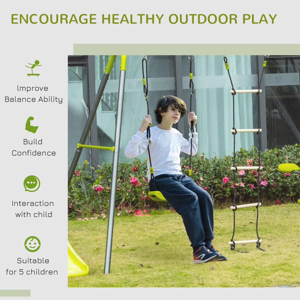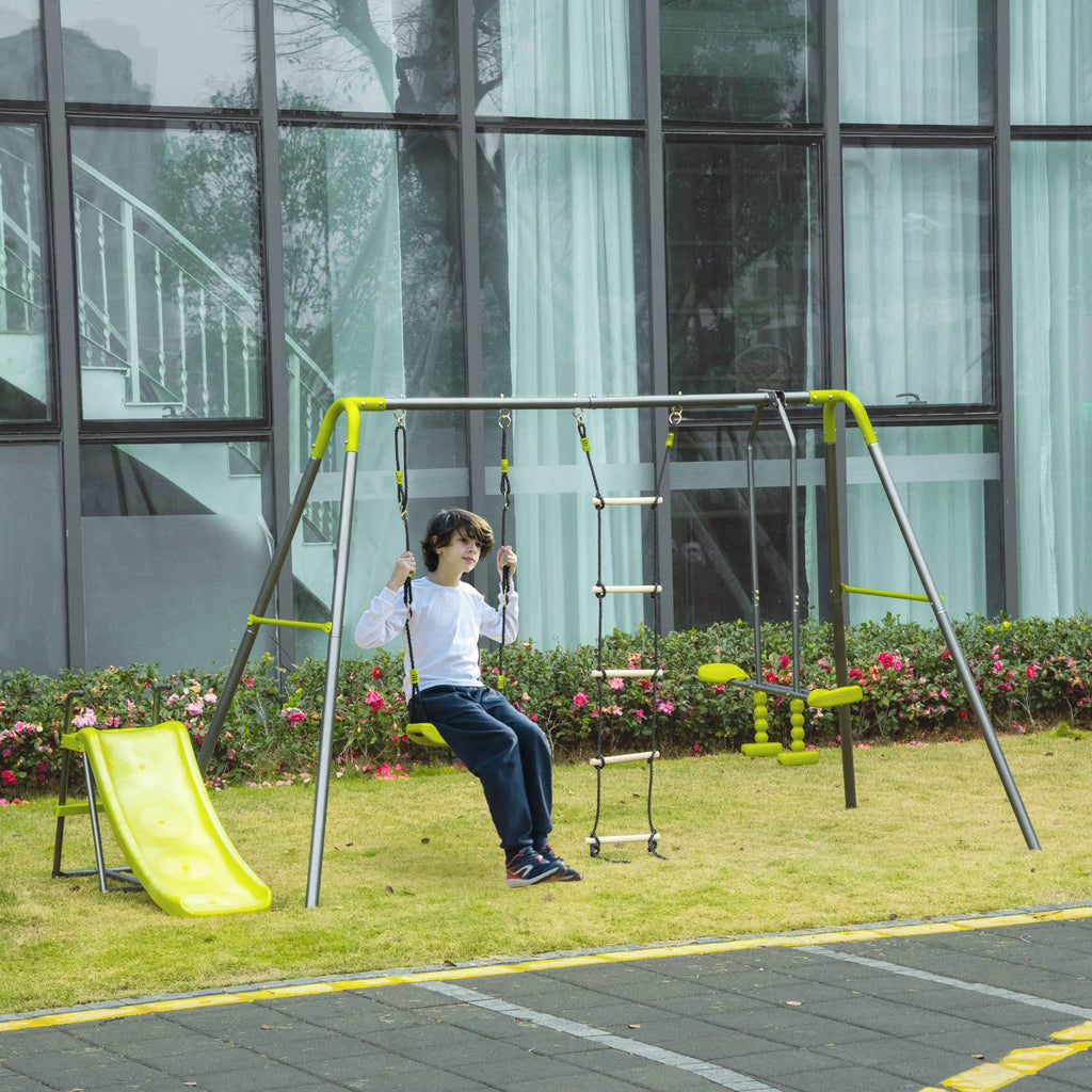 Fai divertire i bambini in compagnia con questo set di altalene da giardino ! La struttura è dotata di un'altalena singola, un'altalena doppia, una corda da arrampicata e uno scivolo per far giocare contemporaneamente 5 bambini. Puoi regolare le corde di sospensione all'altezza che preferisci, facilmente e in poco tempo. La struttura a forma di A in acciaio garantisce la massima stabilità e sicurezza. Porta il divertimento nel tuo giardino!