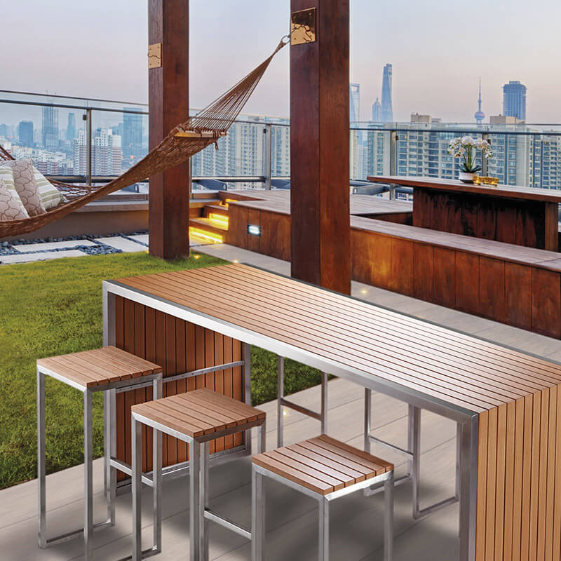 Il set bar Donatello, unico per stile ed eleganza, è realizzato con materiali HIGH TECH in sumpar wood e acciaio inossidabile. È difficile trovare la corretta traduzione italiana del sumpar wood in quanto si tratta di un materiale completamente nuovo la cui formula e molto complessa e comunque segreta. Il sumpar wood è un materiale innovativo che al tatto e al suono simula il legno, ma si tratta di un materiale sintetico molto resistente che non assorbe liquidi, non si macchia e garantisce una protezione contro gli agenti atmosferici e ai raggi UV a lunghissimo termine senza bisogno di alcun tipo di trattamento. Altro materiale speciale che forma questo articolo è l'acciaio inossidabile, che oltre ad essere inattaccabile dagli agenti atmosferici, consente di realizzare una struttura con spessori ridotti ma altamente resistente. Il risultato è un articolo unico, tecnologico, che con le sue linee essenziali potrà essere il protagonista perfetto dei migliori ambienti di convivio sia pubblici che privati.