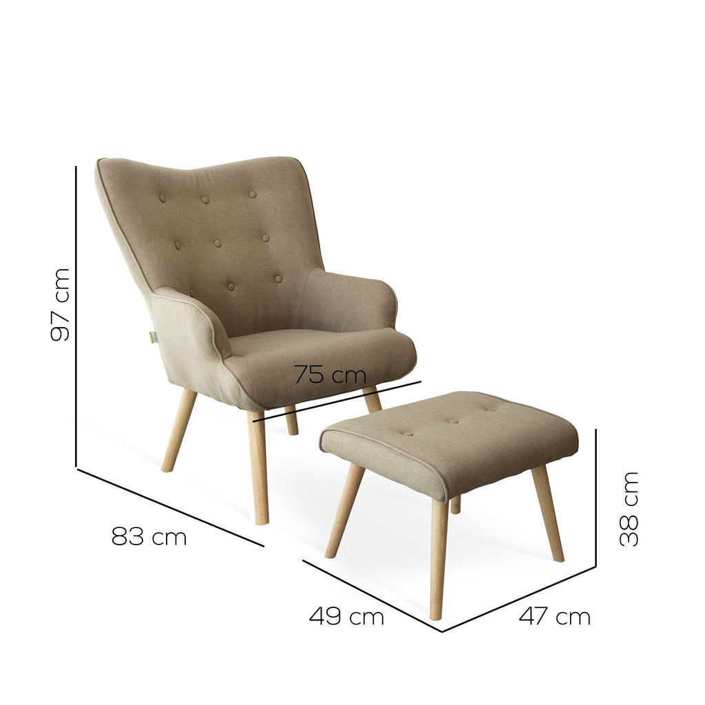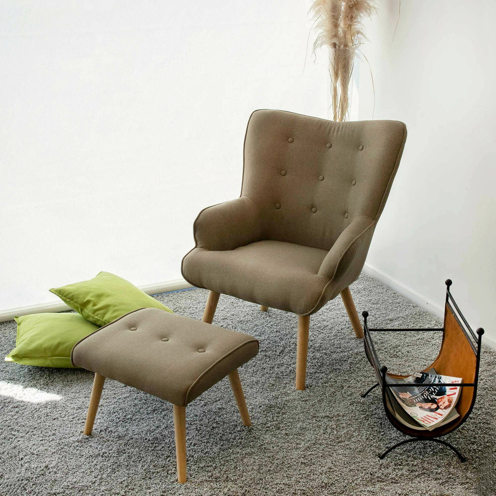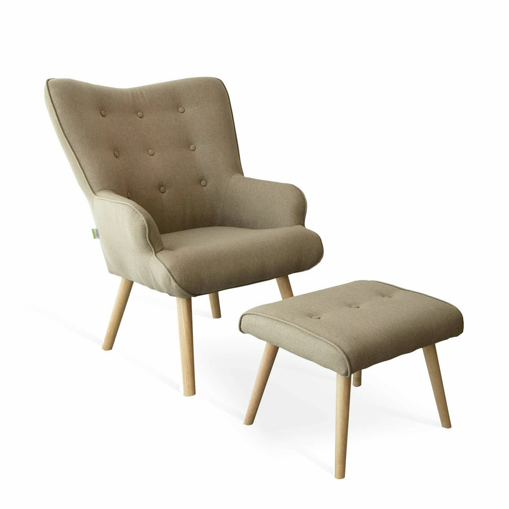 Moderna e al tempo stesso dall'aria vintage la poltrona Biki con il suo poggiapiedi doneranno carattere al living o soggiorno. Le gambe in rovere esaltano lo shienale e la seduta della poltrona e la seduta del poggiapiedi rivestiti in tessuto tortora, regala a Biki un'allure unico.