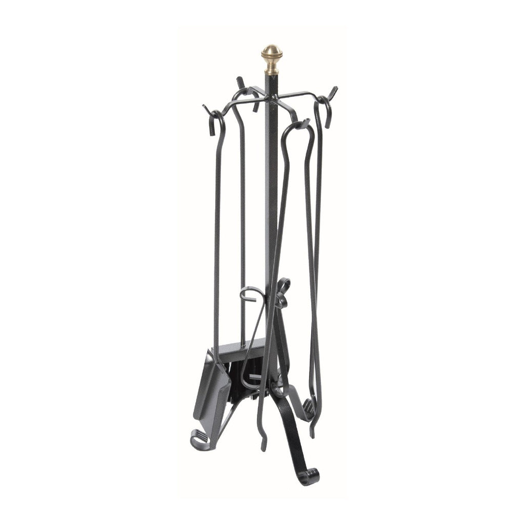 Trespolo cm 22x22xh66, realizzato in ferro quadro mm 14, con pomolo in ottone zigrinato diam. mm 30, costituito da 4 elementi (paletta, scopino in PVC, attizzino, pinza), verniciato colore grigio martellato, Made in Italy, facile da pulire con un panno umido, montaggio non richiesto