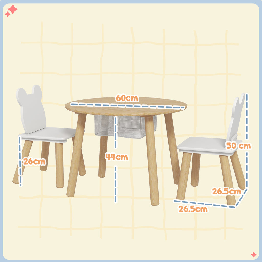 Set con Tavolo e 2 Sedie per Bambini con Schienale a Orsetto Tavolino con Vano Contenitore in MDF Bianco e Legno