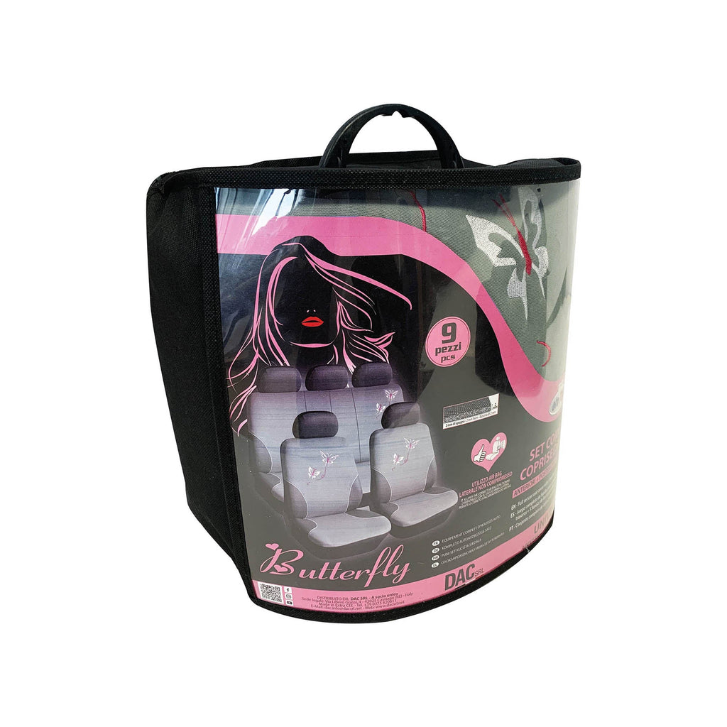 - Il kit comprende 9 pezzi: due coprisedili anteriori, la seduta dei sedili posteriori e lo schienale, e i cinque copri poggiatesta