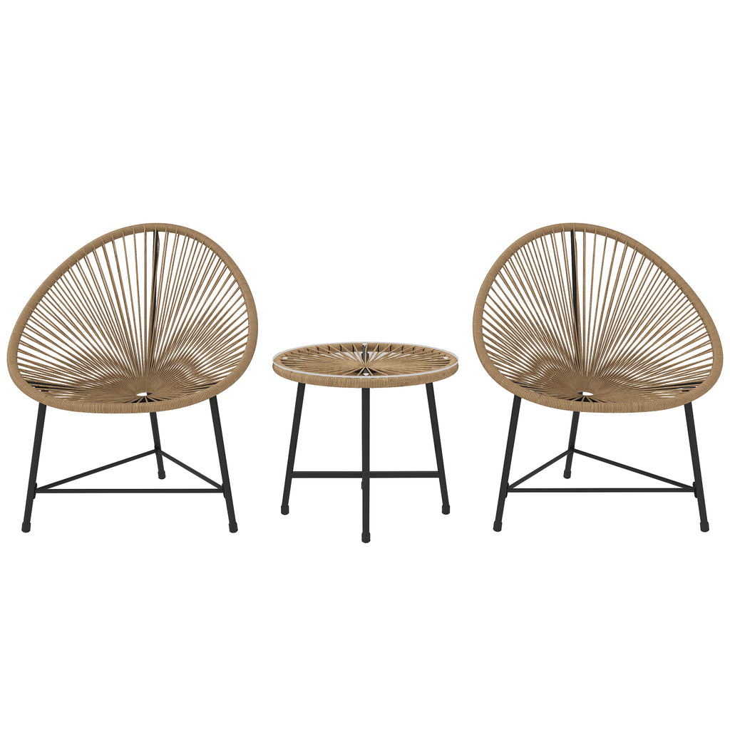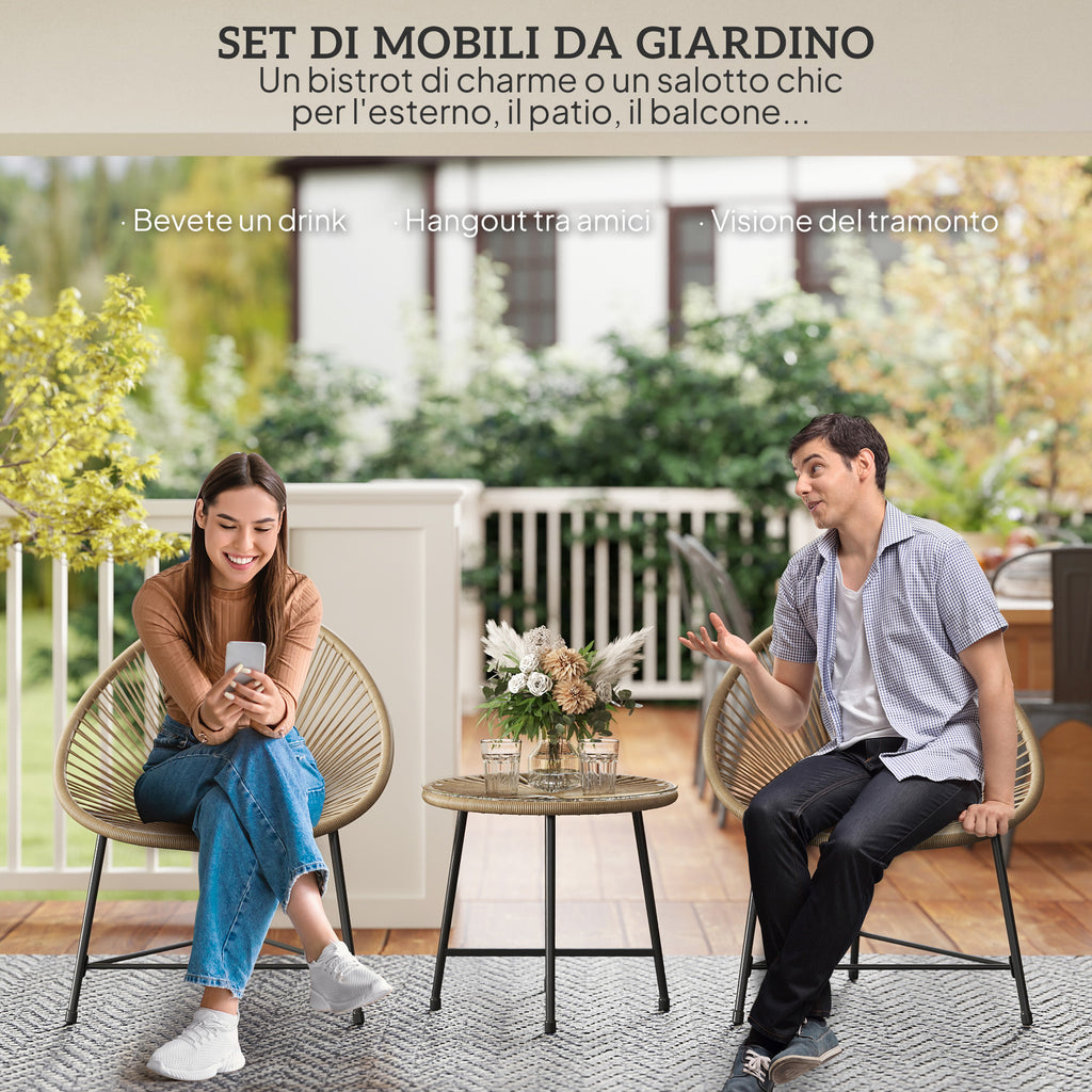 Goditi i tuoi spazi all'aperto nella bella stagione con il set da giardino composto da 2 sedie ovali e un tavolo abbinato. Il rattan PE delle sedute migliora la ventilazione e offre un comfort avvolgente, mentre il tavolo da giardino è dotato di un piano in vetro temperato elegante e semplice da mantenere. La struttura in acciaio e i piedini antiscivolo garantiscono invece la giusta stabilità e robustezza. Rilassati nel comfort e stile del nostro set da esterno! Set da esterno composto da 2 sedie da giardino e un tavolo abbinato per regalare relax nei piccoli spazi aperti. Le sedie ovali Acapulco sono rivestite in rattan PE per offrirti il massimo relax. Struttura in acciaio verniciato a polvere con struttura rinforzata per dare robustezza. Tavolo da giardino con piano in vetro temperato, elegante, raffinato e facile da pulire. I piedini regolabili aggiungono stabilità ed evitano segni sul terreno. Montaggio necessario.