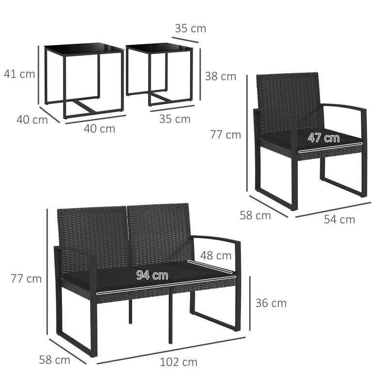 - DIMENSIONI: Dimensioni sedia: 54L x 58P x 77A cm. Dimensioni divanetto: 102L x 58P x 77A cm. Dimensioni tavolini: 40L x 40P x 41A cm (grande), 35L x 35P x 38A cm (piccolo). Montaggio richiesto