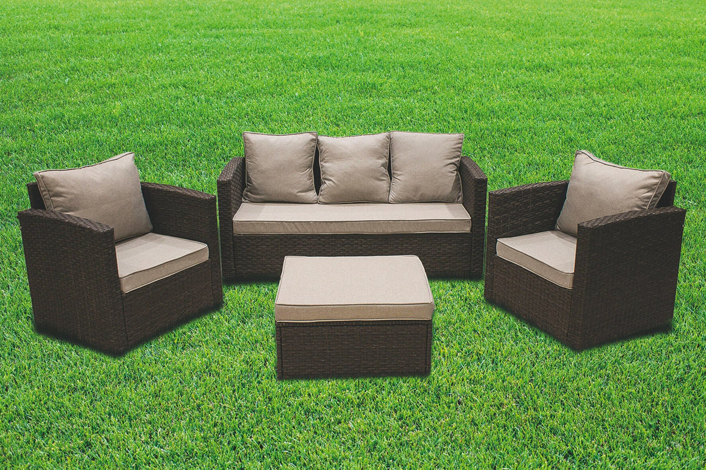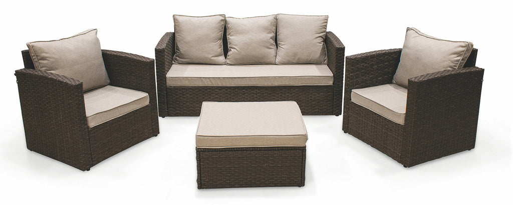 Un esclusivo set da giardino completo di tutto quello che occorre per vivere l'estate e gli spazi esterni in totale relax e comodità. Realizzato in ferro è caratterizzato da un rivestimento in polyrattan. L'elevata qualità del materiale rende ogni pezzo resistente agli agenti esterni e facile da pulire, senza particolari trattamenti. Le sedute sono corredate da morbidissimi cuscini in poliestere che renderanno più confortevole la seduta.