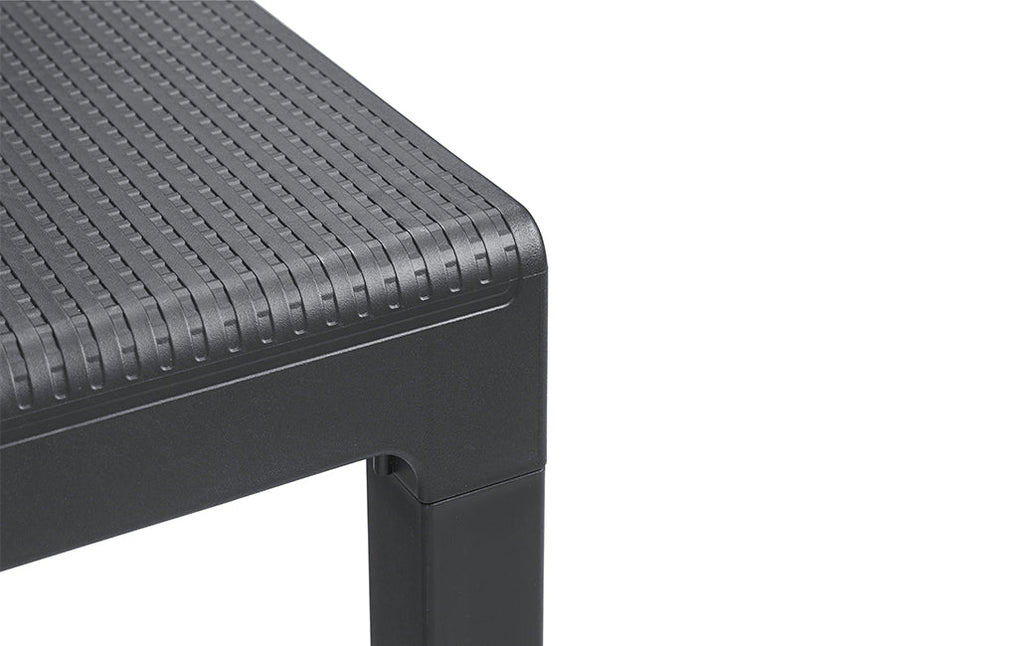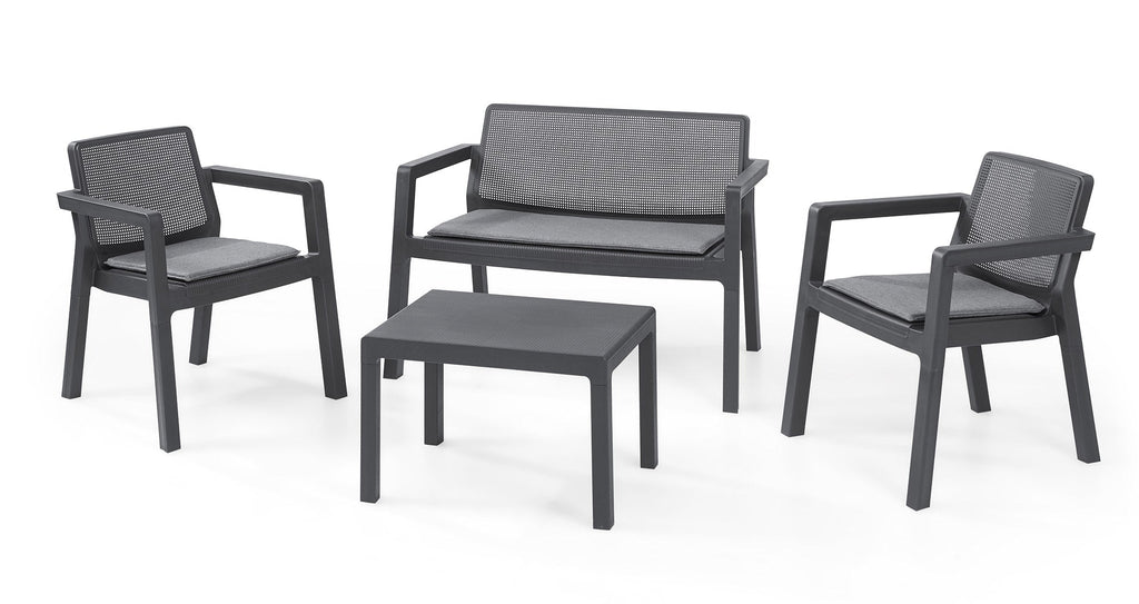 Emily Lounge Set è un set dalle linee essenziali composto da due poltrone, un divano e un tavolino. Facile da assemblare. È realizzato con resina durevole e resistente agli agenti atmosferici e con una caratteristica finitura che restituisce le sensazioni di una superficie liscia.