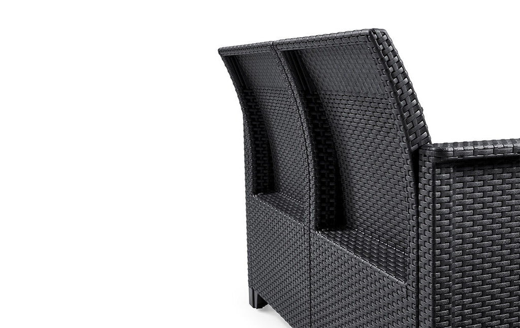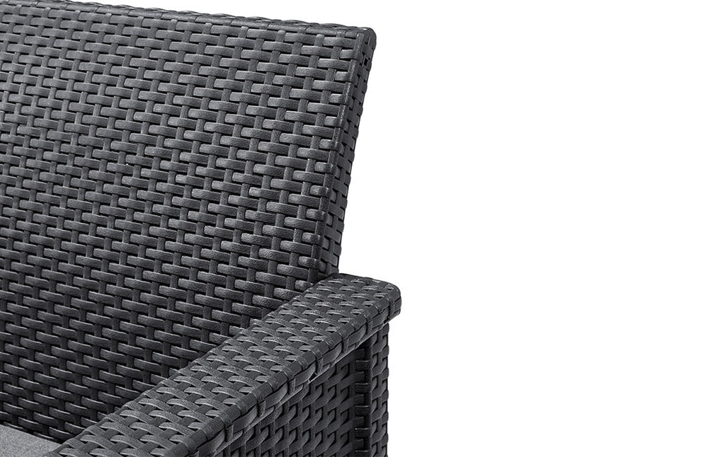 Trasforma i tuoi spazi esterni con Emma Lounge Set. Il set include un divano a due posti, due poltrone e un tavolino contenitore. Dotato di cuscino per la seduta. L'ampio tavolino contenitore è ideale per riporvi i cuscini quando non vengono utilizzati. Realizzato con resina resistente agli agenti atmosferici e ai raggi UV, non richiede manutenzione, non marcisce e non scolorisce. Assembla rapidamente in soli 20 minuti, senza la necessità di alcun attrezzo.