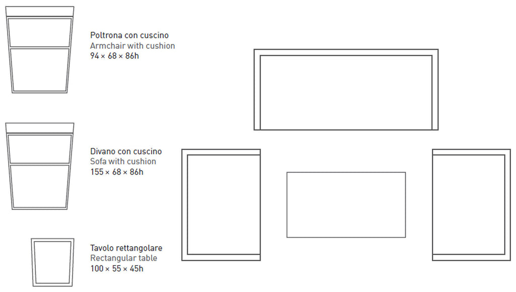 - Set composto da: 2 poltrone + 1 divano + 1 tavolino