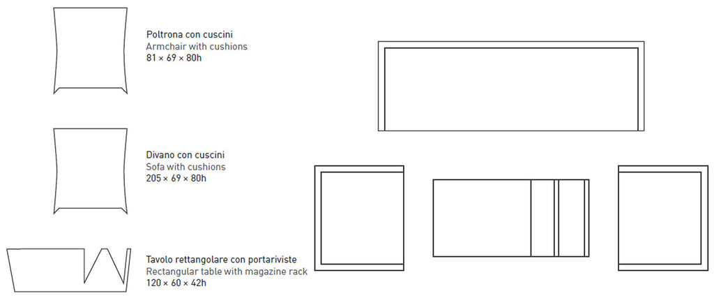 - Set composto da: 2 poltrone + 1 divano + 1 tavolino