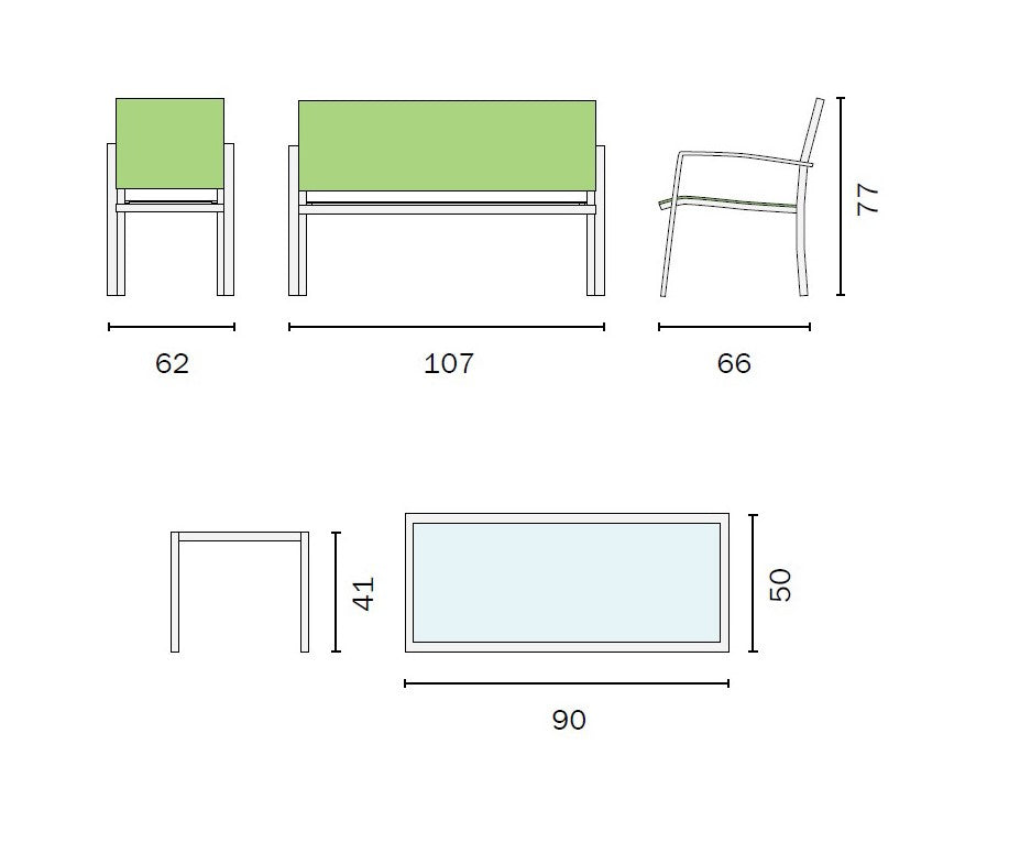 1 Divano: L.107cm x P.66cm x H.77cm.