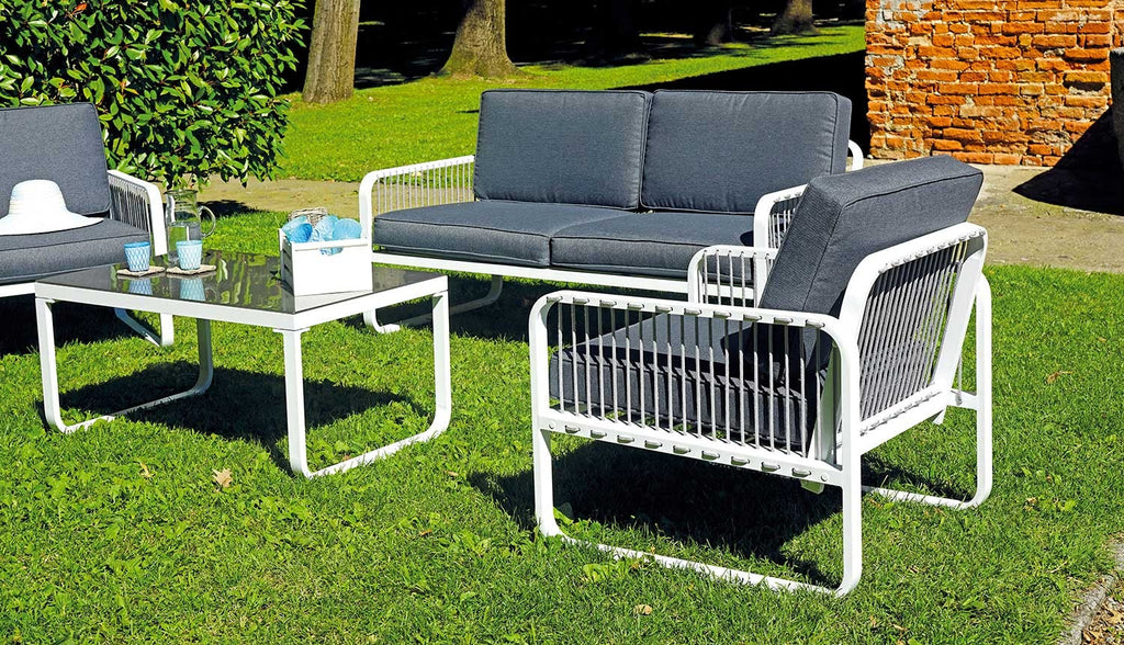 Set Salotto da Giardino 1 Tavolino 1 Divano 2 Poltrone in Alluminio e Corda Vorghini San Fruttuoso Bianco e Grigio con Cuscini