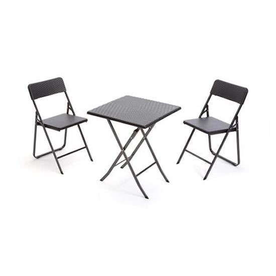 Set tavolo pieghevole + 2 sedie pieghevoli, struttura tavolo e sedie in ferro verniciato a polvere colore Grigio scuro, piano d'appoggio, seduta e schienale in HDPE (Polietilene Alta Densità) colore nero con trattamento UV, spessore piano d'appoggio cm.2.5, dimensioni tavolo cm. 62 X 62 X h74, sezione tubolari mm. 14 X 28, dimensioni sedia cm 48.5 X 42.5 X 81, sezione tubolari mm. 14 X 28Set da Giardino Pieghevole in Polietilene 2 Sedie e Tavolo Quadrato Taddei Plastik Rattan 62 Nero