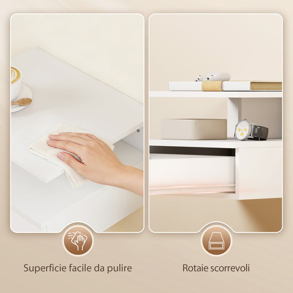 Dona eleganza alla tua camera con questo set di 2 comodini sospesi. Dotati di cassetto, mensola aperta e superficie piana, offrono spazio per oggetti essenziali. Il design sospeso libera spazio a terra, protegge dall'umidità e mantiene ordine. Ideali per spazi ridotti o per chi cerca un look moderno e pratico.
