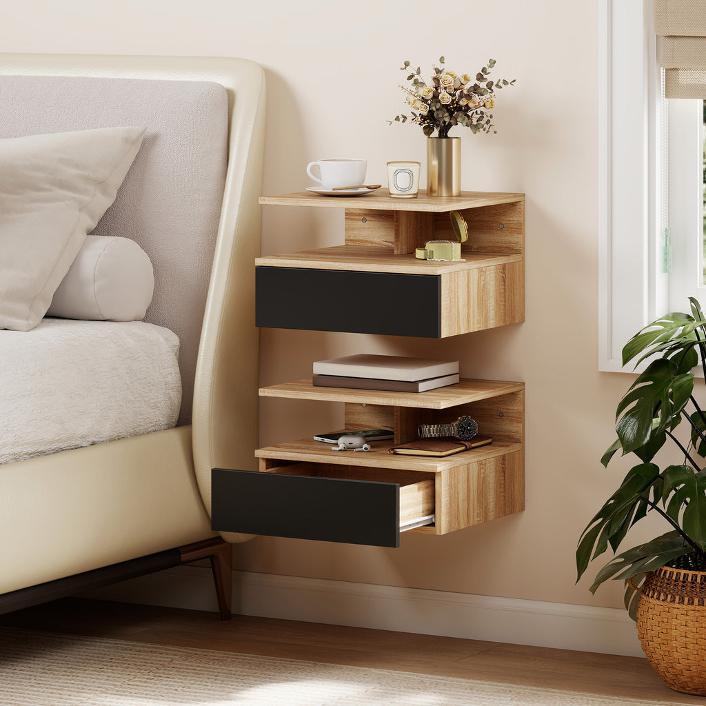 Set di 2 Comodini Sospesi 35x32x22,5 cm con Cassetto e Mensola Aperta in Legno Nero e Rovere
