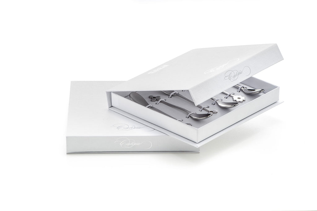 CADEAU è una linea di 6 graziosi cucchiaini espresso & moka (112 mm) in acciaio inossidabile 18/10 lucidato a specchio. Si distingue per il terminale personalizzato con 6 diversi disegni. Cuore, Elica, Trifoglio, Quadrifoglio, Margherita, Giglio.....come fiori che sbocciano in un campo! Questo oggetto minimalista dal design evocativo (nascita di un fiore) è particolarmente indicato come bomboniera per battesimo e nascita.