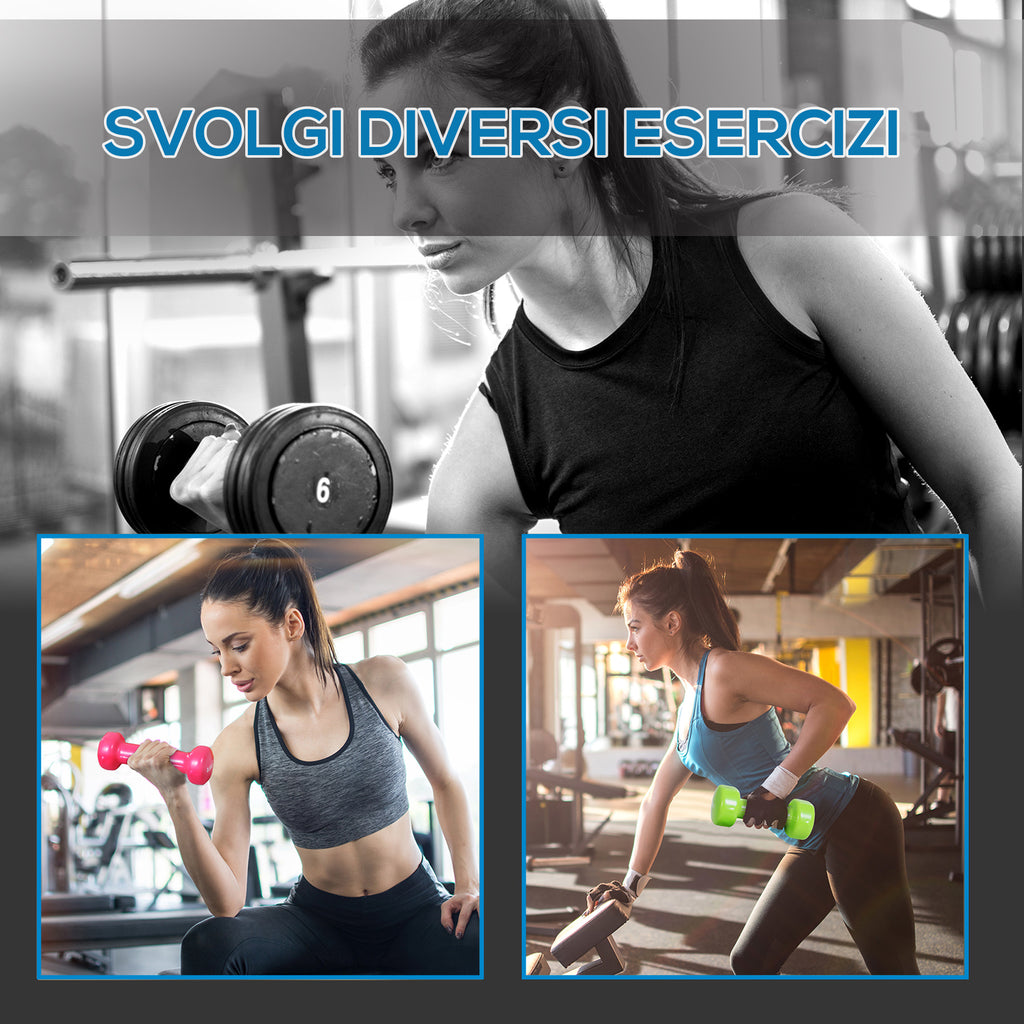 - 4 paia di manubri colorati, 0,5 kg, 1 kg, 1,5 kg, 2 kg, per soddisfare le diverse esigenze di allenamento e le fasi di ogni esercizio
