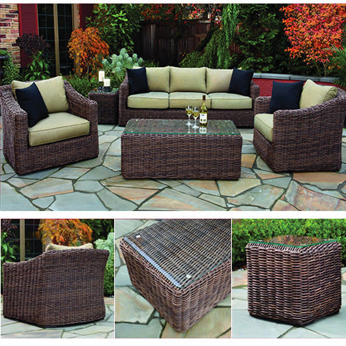 Salotto in kit in polirattan composto da divano, due poltrone e due tavolini con vetro temperato. Il set comprende anche cuscini di spessore 13 cm.