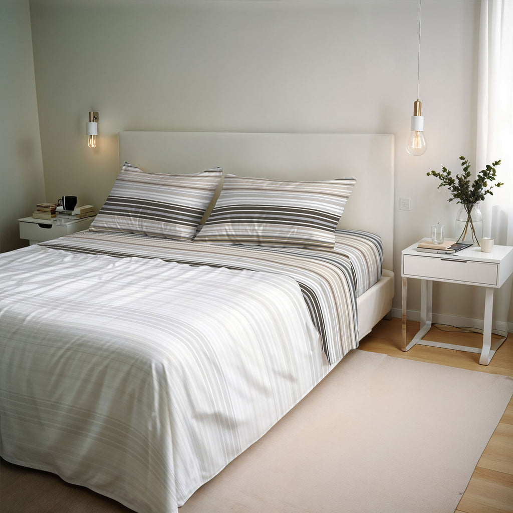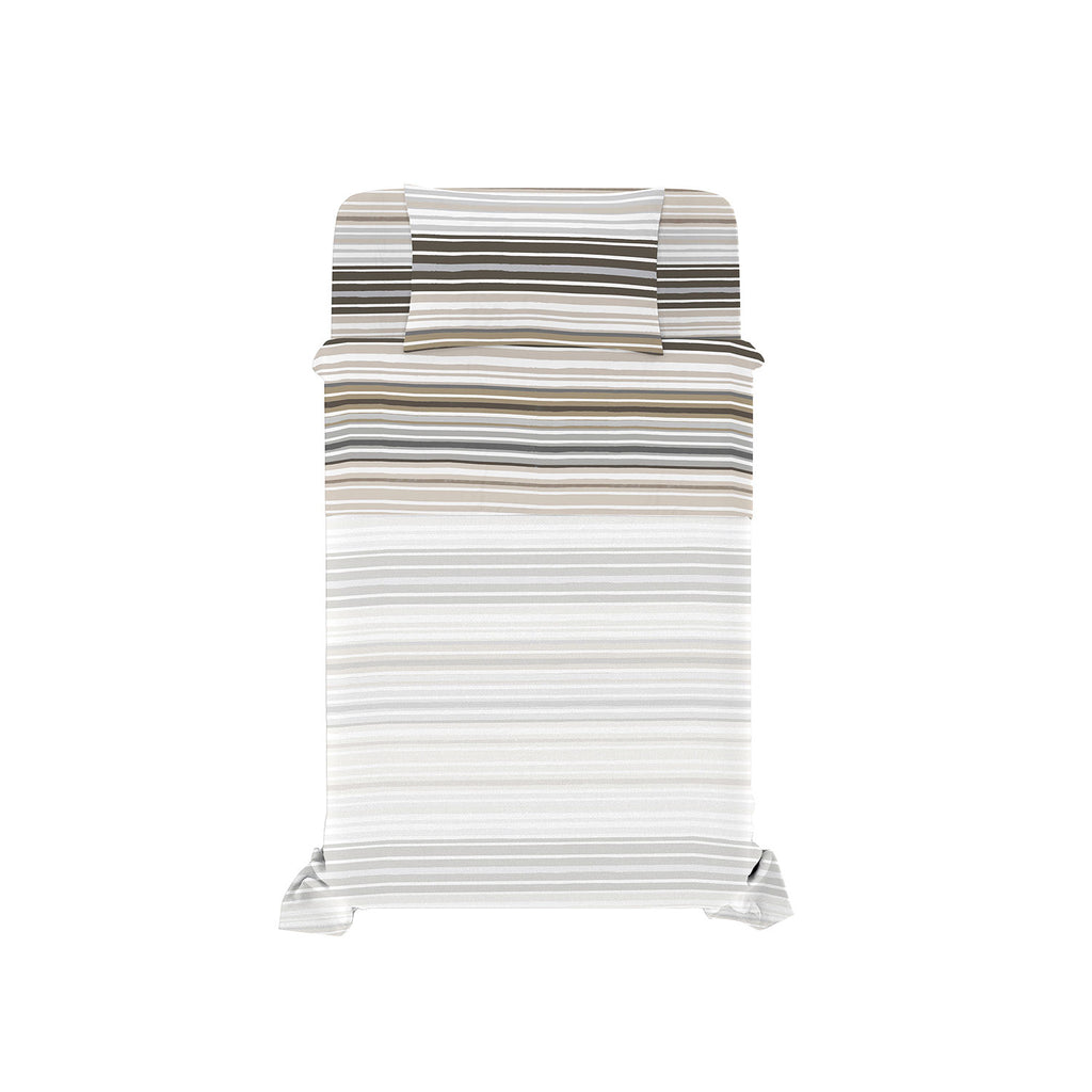 Rinnova il tuo letto con il completo letto River, un set completo e di alta qualità che include un lenzuolo sopra, un lenzuolo sotto con angolo elastico e federe coordinate. Disponibile in molte fantasie eleganti e moderne, questo completo è lavorato con cura in Italia, garantendo stile e durata. Il tessuto è composto dall’80% cotone e dal 20% di fibre miste riciclate, offrendo un comfort morbido e sostenibile. Perfetto per chi cerca un set letto pratico, eco-friendly e dal design ricercato.