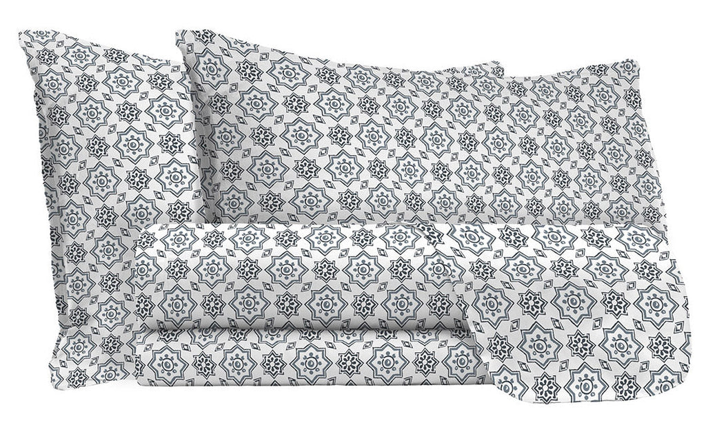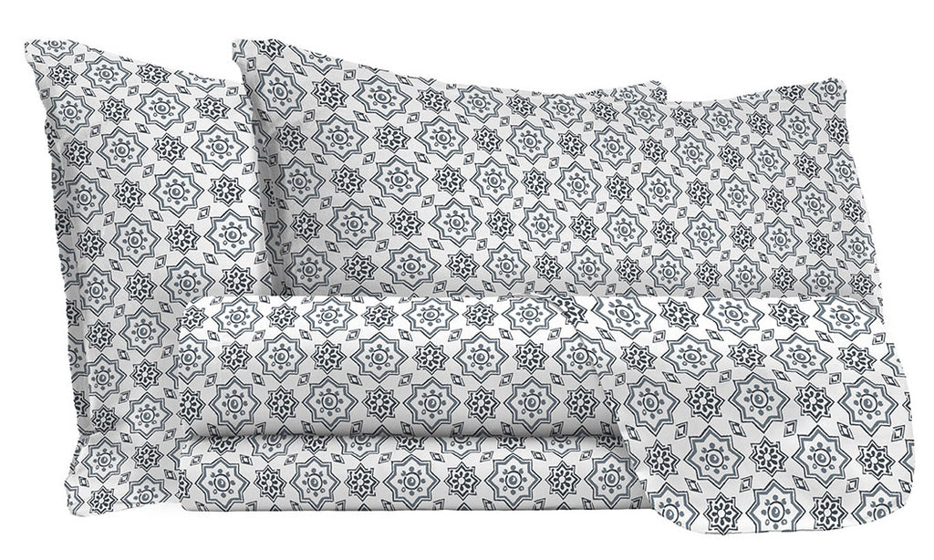 Il set è composto da lenzuolo sopra, lenzuolo sotto e federe. Studiato, assemblato e cucito interamente in Italia, realizzato in Cotone.
